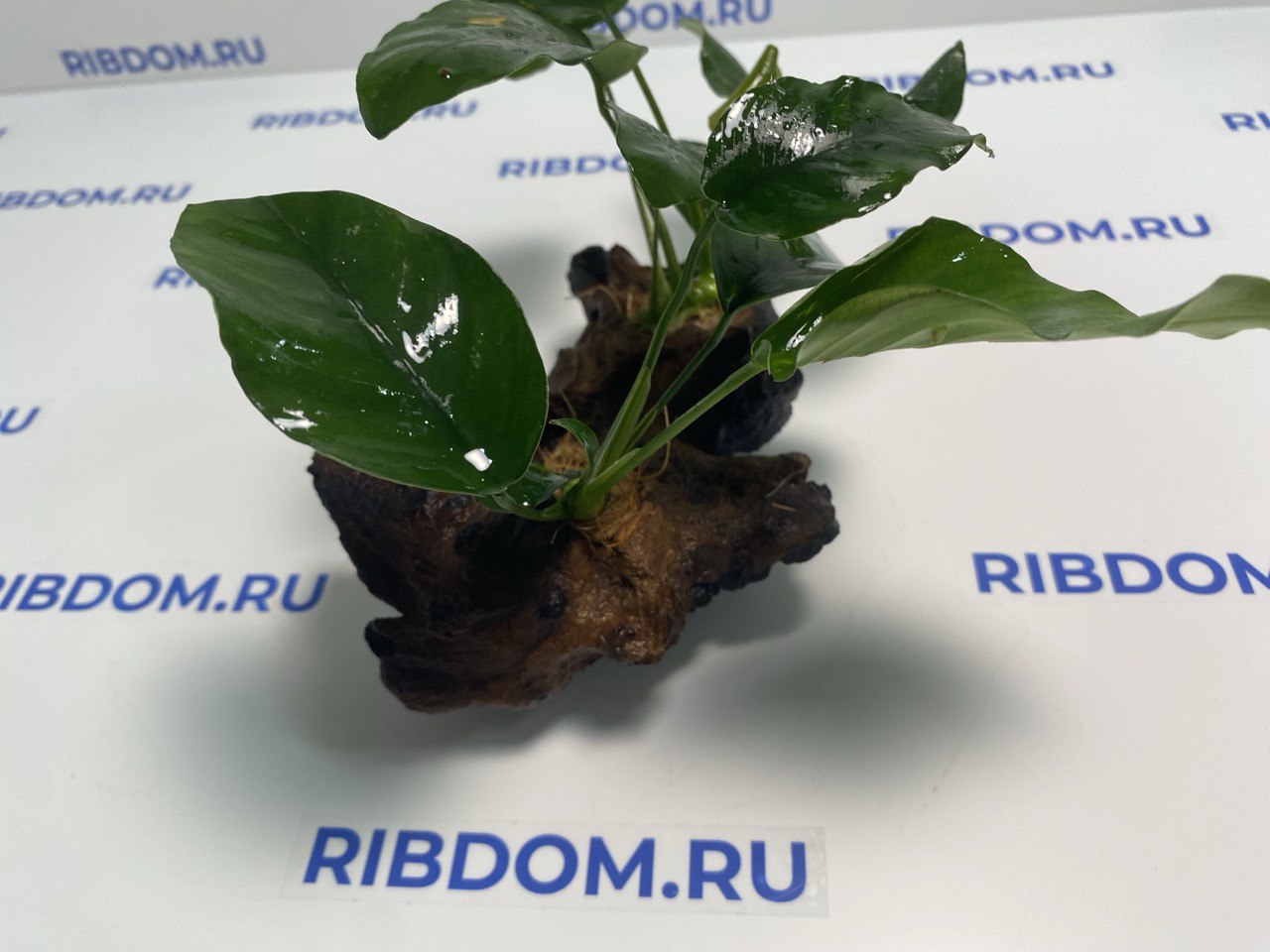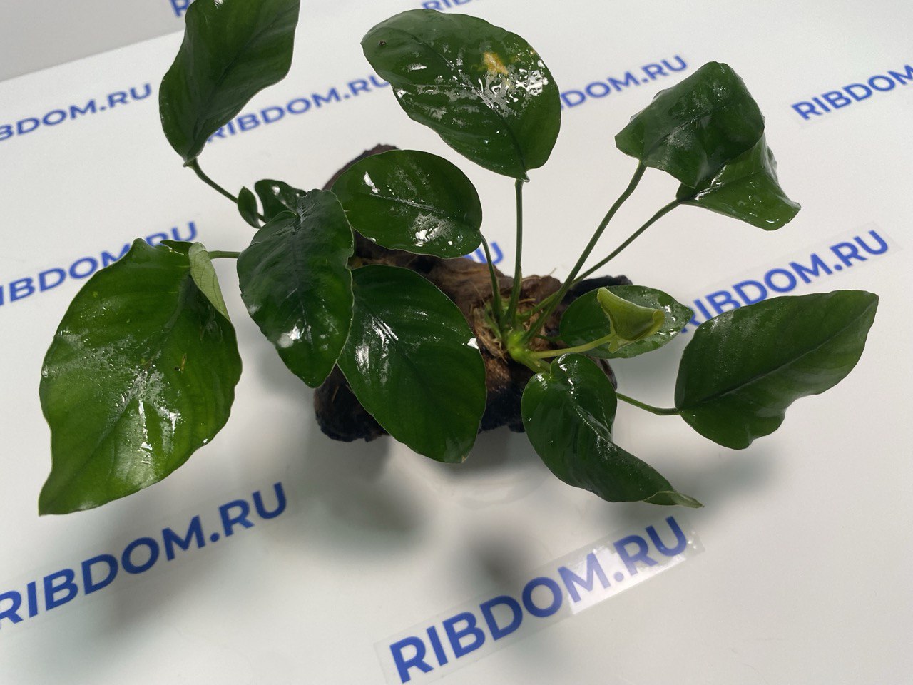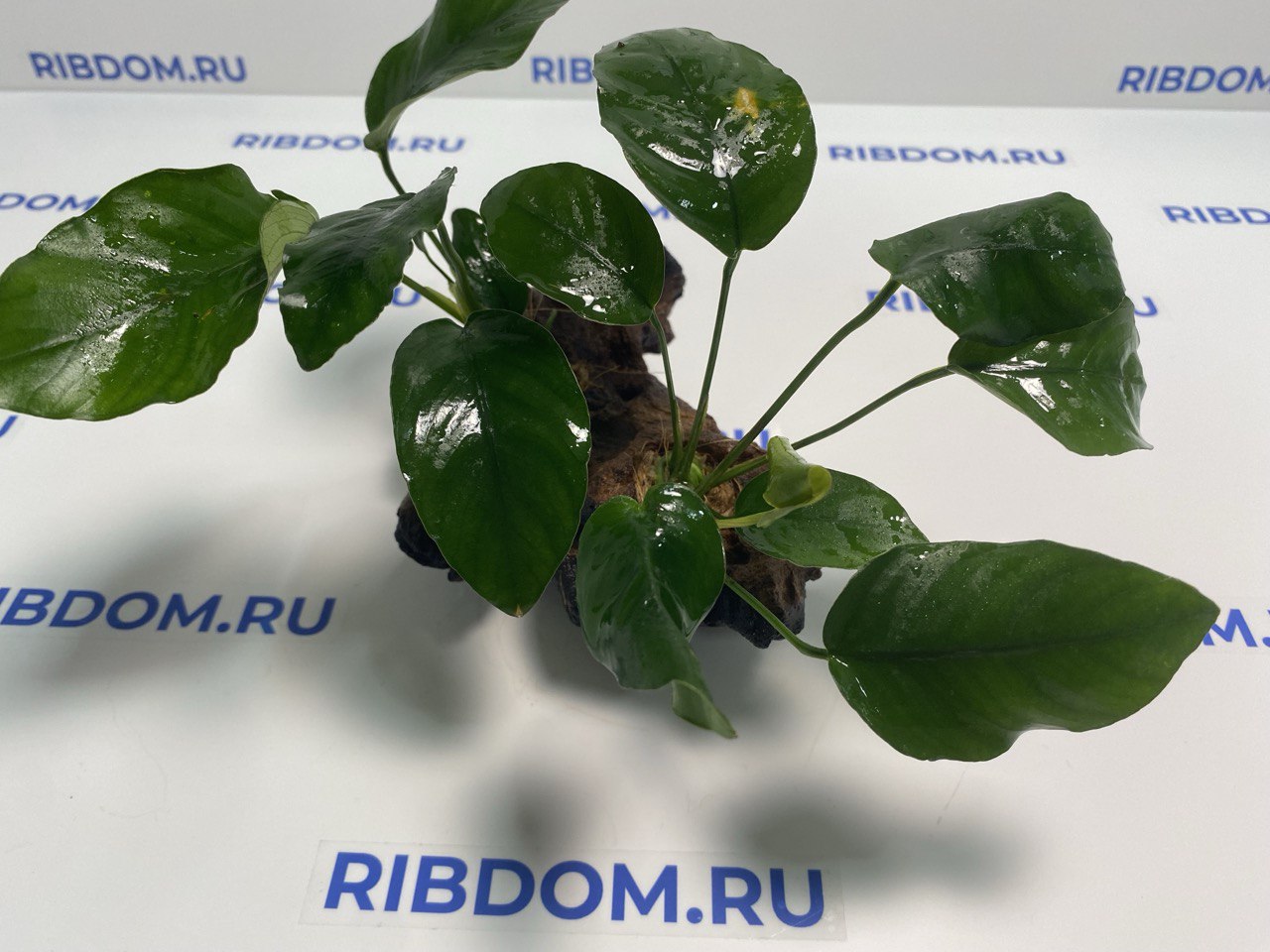 Это карликовый сорт Anubias barteri. Толстые темно-зеленые листья этого растения на коротком стебле одни из самых маленьких и компактных в роде Anubias, вырастающие всего до 8 см при общей высоте 12 см.