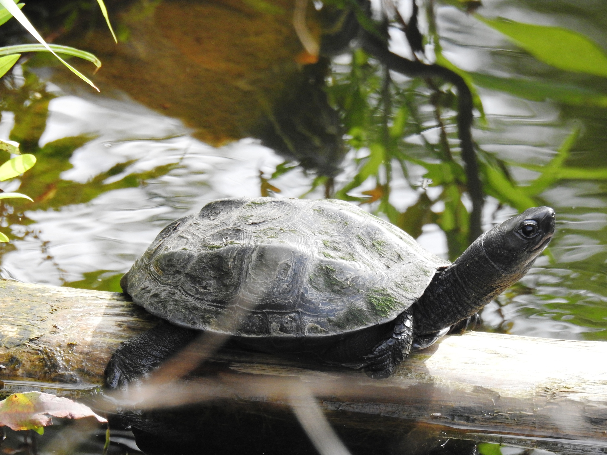 - Полуводный образ жизни. Черепаха греется на солнце на камнях или бревнах.
