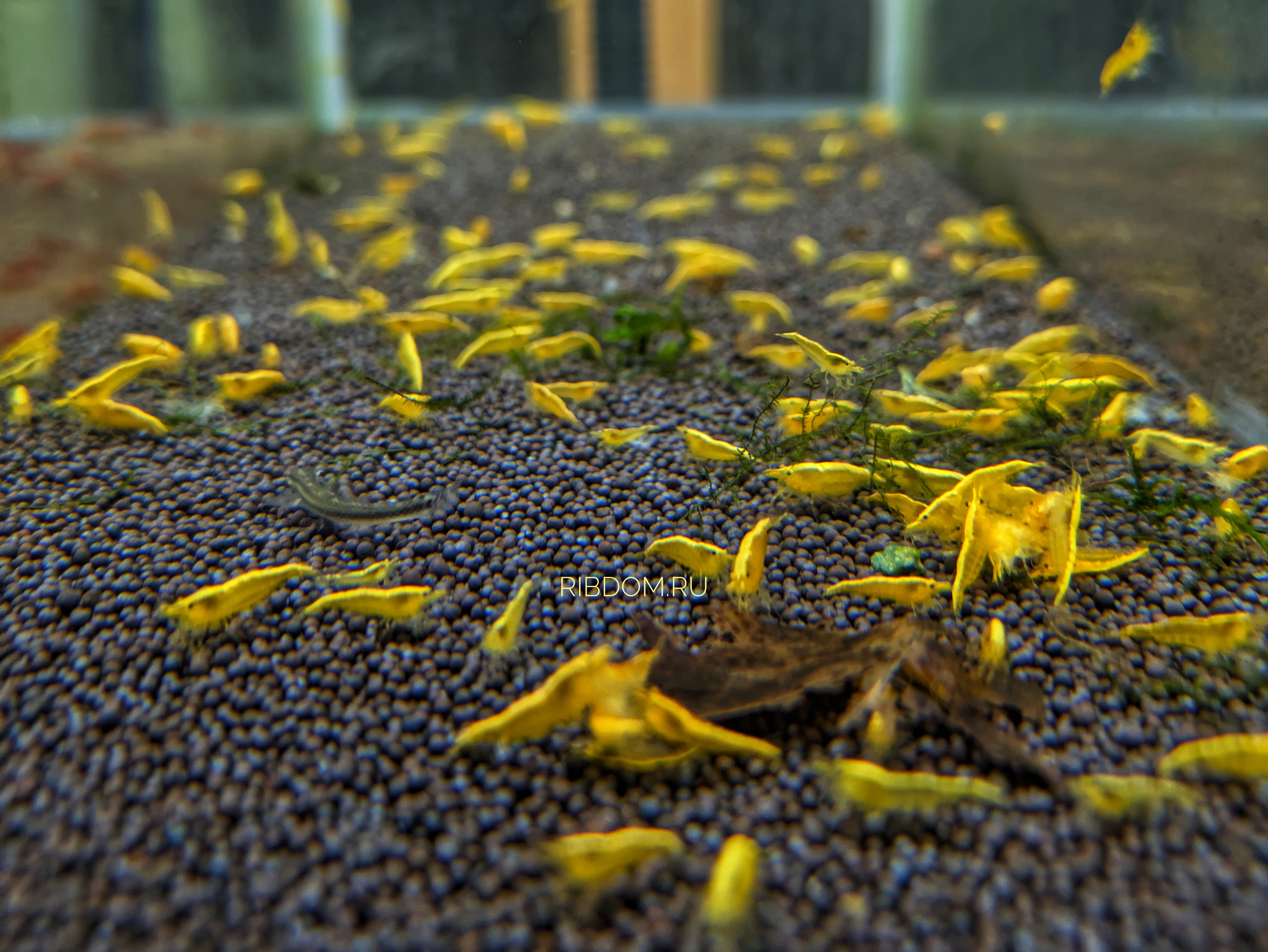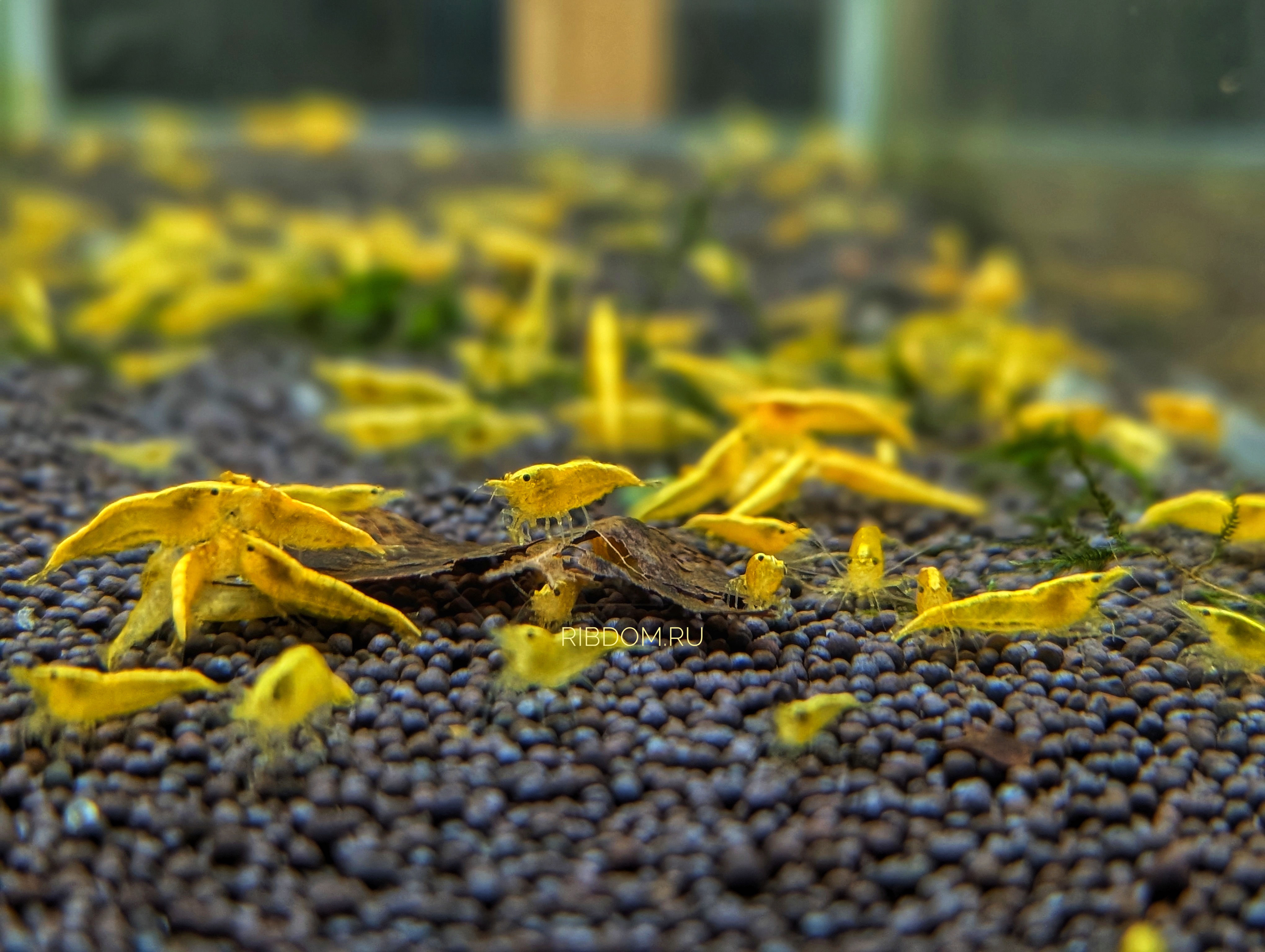Размножение: своей половозрелости креветка жёлтая неоновая достигает в 4-месячном возрасте. Если следить за качеством воды в аквариуме, то они практически постоянно размножаются.