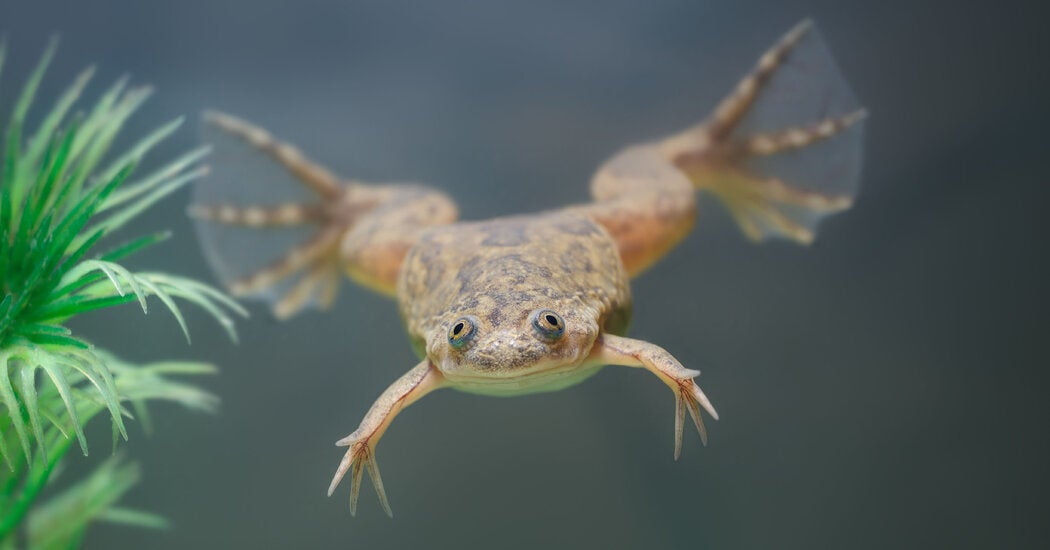 Перепонки между пальцами на передних лапках — характерный признак вида. Эта особенность и дала название лягушке: научный термин Hymenochirus дословно переводится как «кожисторукий».