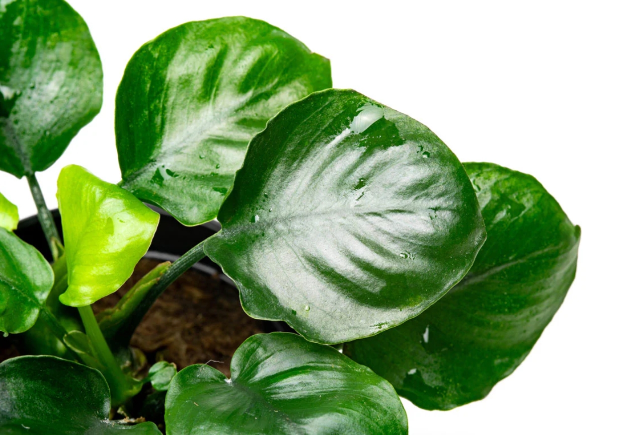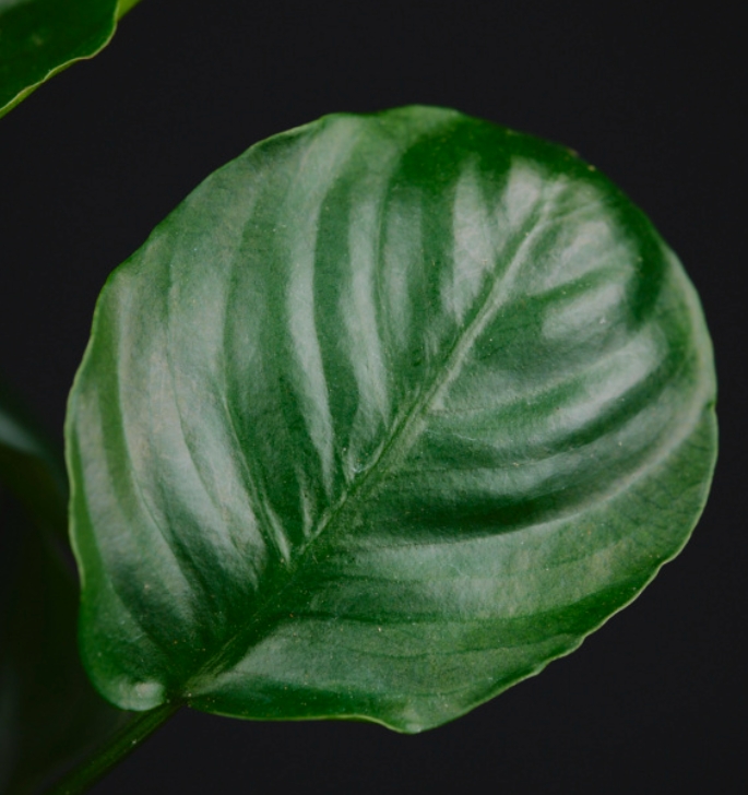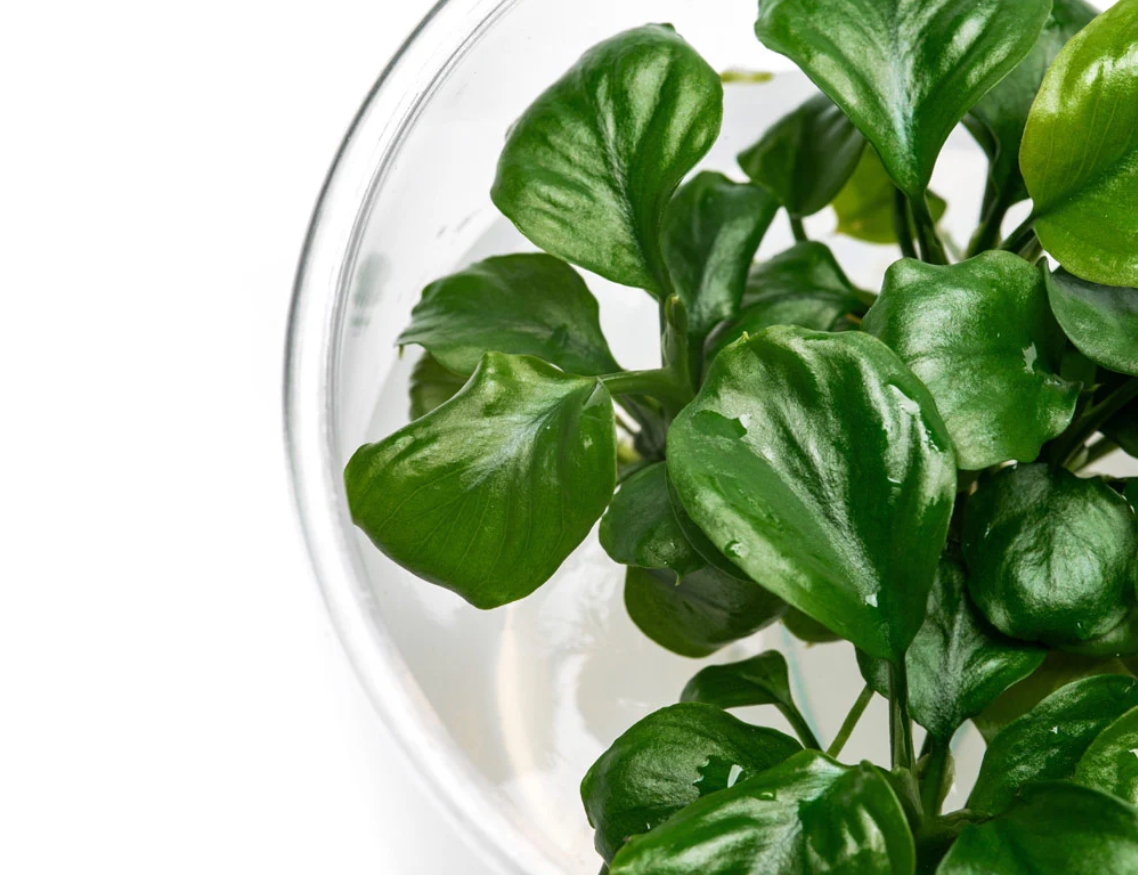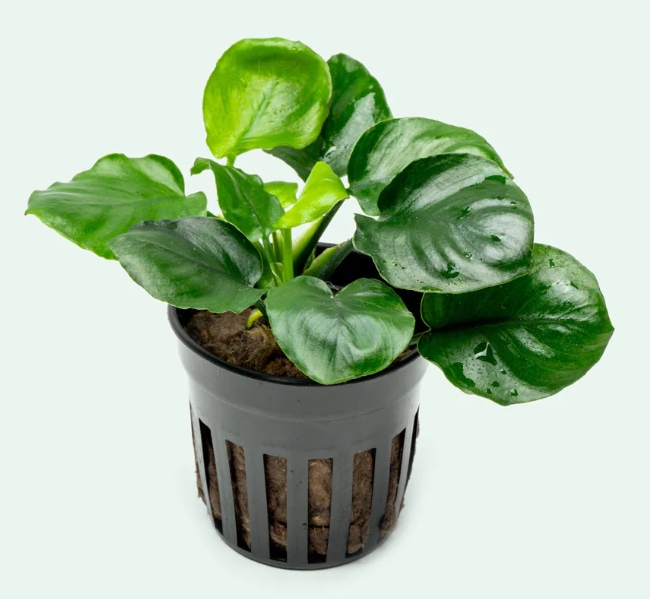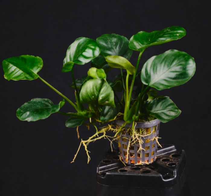 Это очаровательная карликовая разновидность анубиаса, легко узнается по своим необычным листьям. В отличие от классического ануба нана с овальной листовой пластиной, у этого сорта листья почти идеально круглые, с небольшим заострением на кончике. Они плотные, кожистые, насыщенного темно-зеленого цвета и расположены на коротких черешках. Растет медленно, формируя компактный и очень густой кустик, который сохраняет аккуратную форму.