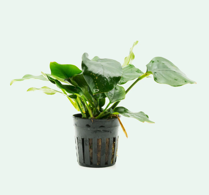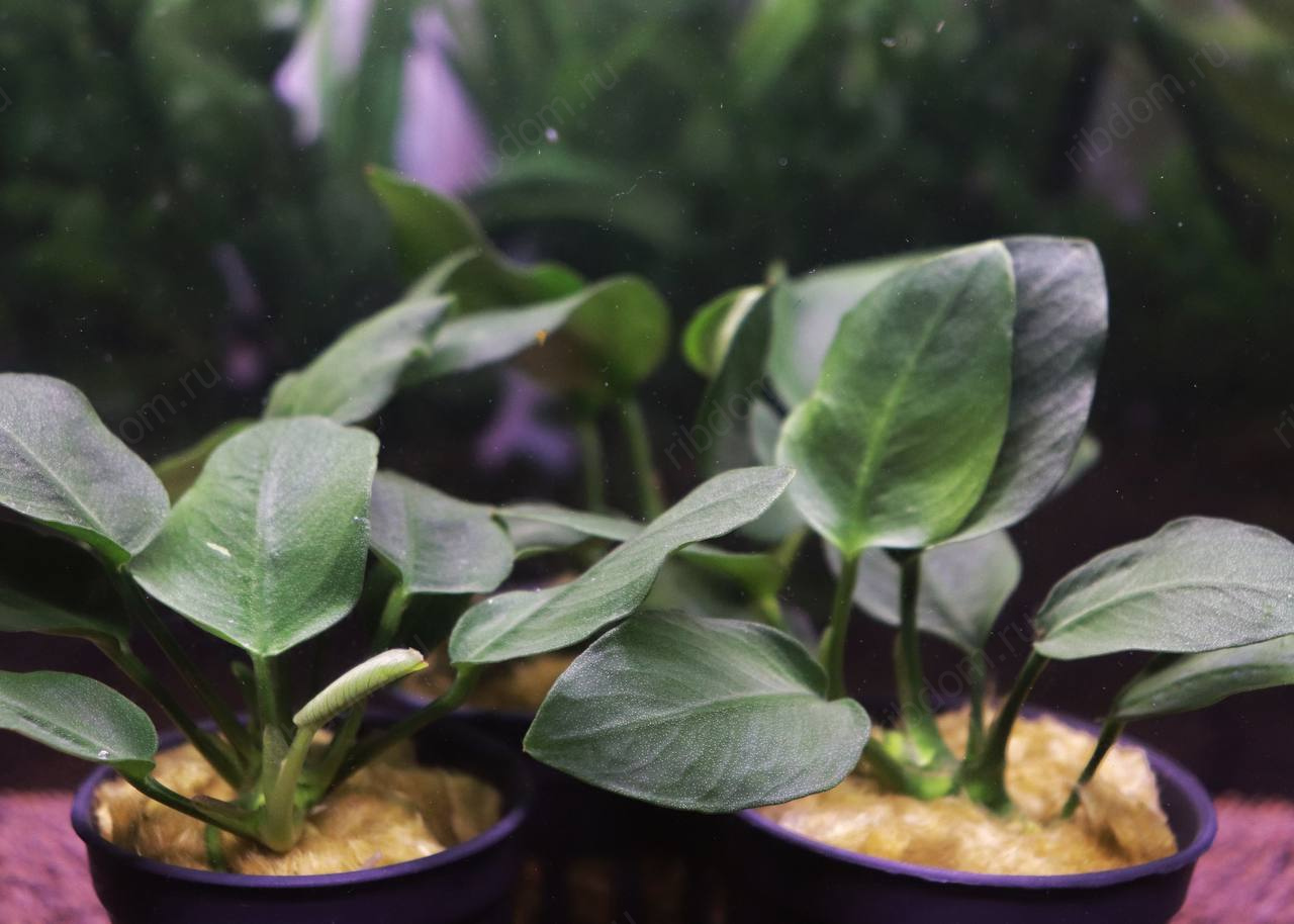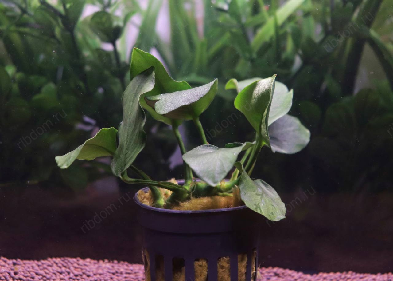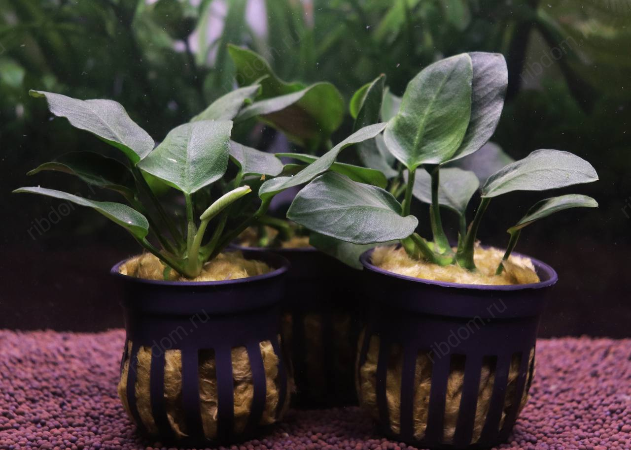 - Посадка — растение является эпифитом. Нельзя заглублять корневище в грунт. Его необходимо прикрепить к декорациям (корягам, лава-камням, пористому камню) с помощью лески, нити или специального аквариумного суперклея на цианакрилатной основе.