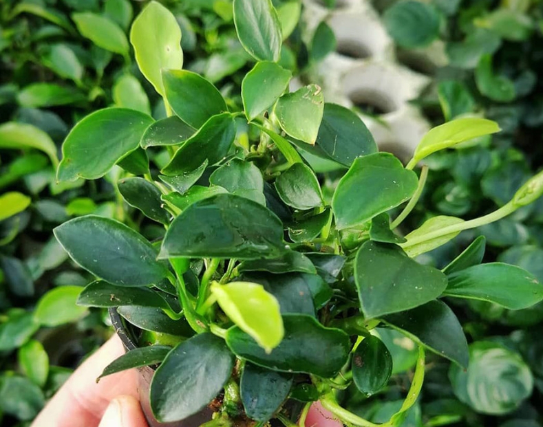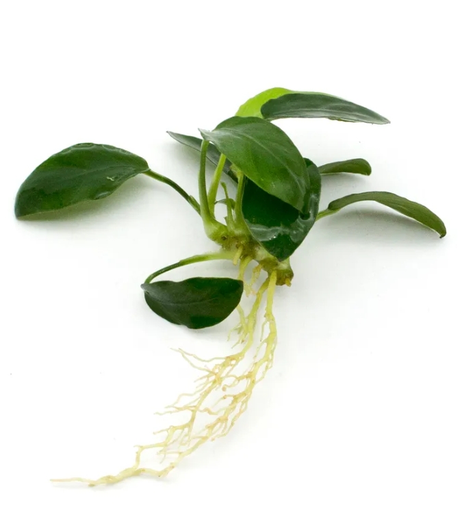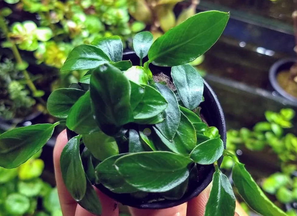 Анубиас нана паксинг компакт — это редкий и очень перспективный карликовый сорт, отличающийся исключительной плотностью роста. Его главная особенность — крайне короткие междоузлия, из-за которого листья, некрупные и классической овальной формы, располагаются настолько близко друг к другу, что образуют практически сплошную, очень плотную и фактурную «шапку». Листья темно-зеленые, жесткие, с глянцевым отливом. Растение выглядит как аккуратный, густой холмик, сохраняющий идеальную форму.