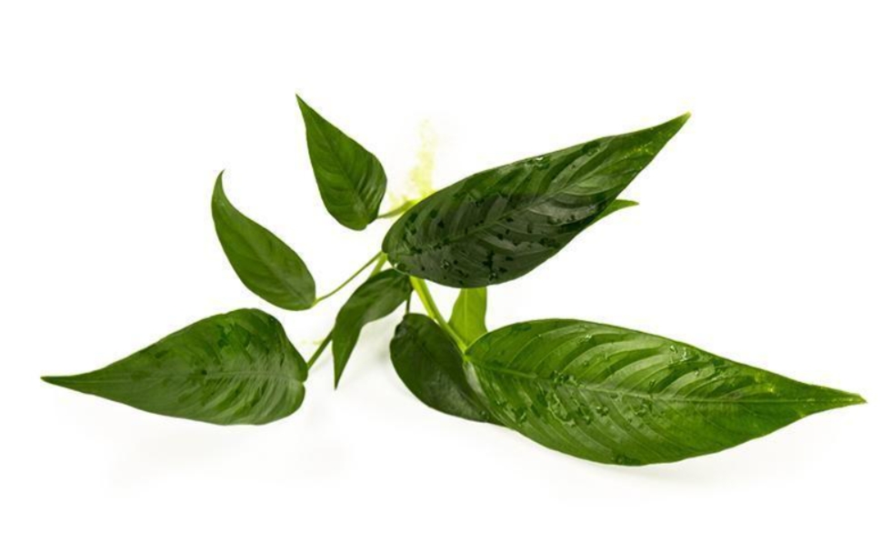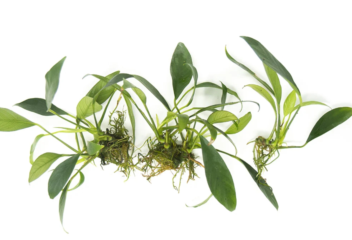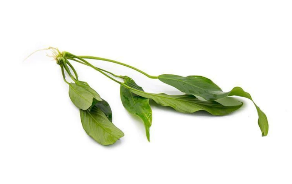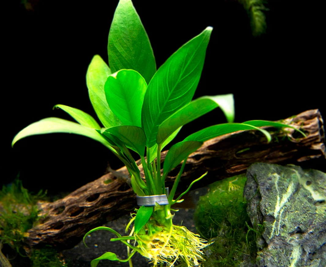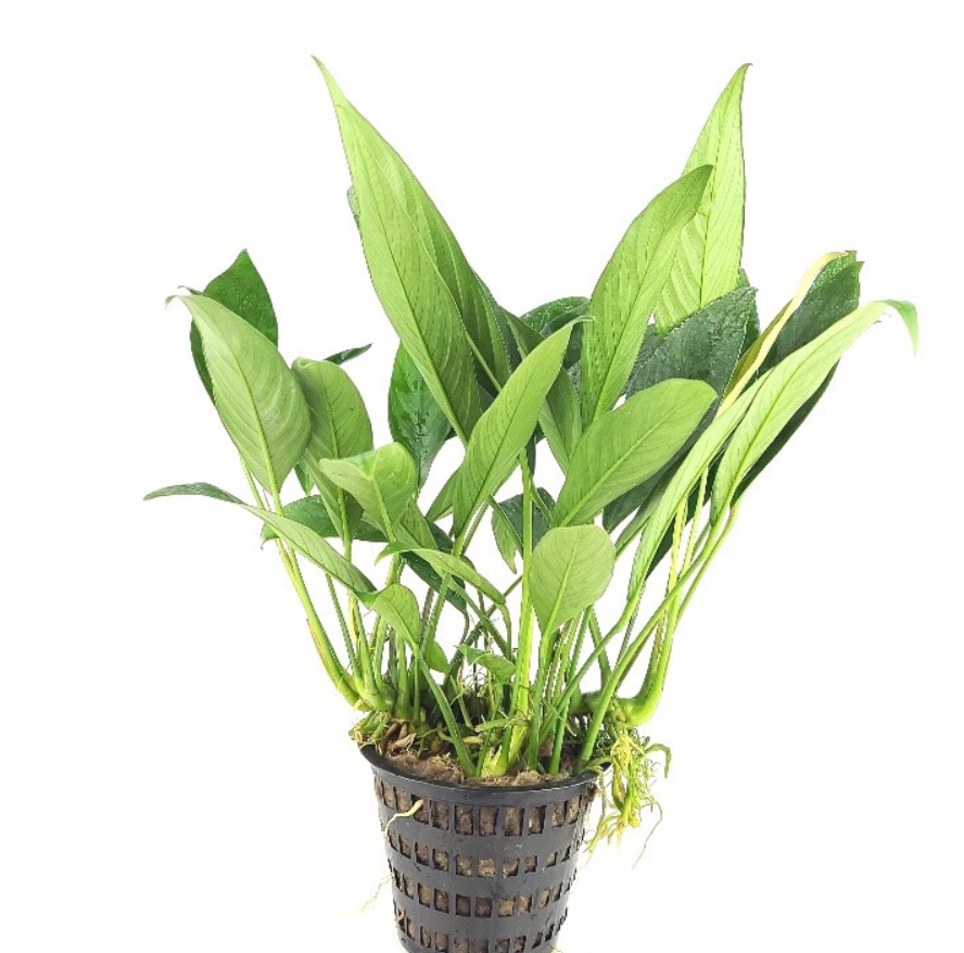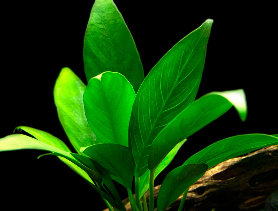 Анубиас ланцетовидный — это элегантный и стройный вид, который выделяется среди других анубиасов удлинённой формой своих листьев. Его главная особенность — узкие, ланцетовидные листовые пластины на длинных, крепких черешках. Листья могут достигать значительной длины, они тёмно-зелёные, плотные, с выраженным рельефом центральной прожилки. Растение формирует живописный, вертикально ориентированный куст, создавая красивые линии и добавляя высоту композиции на заднем или среднем плане.