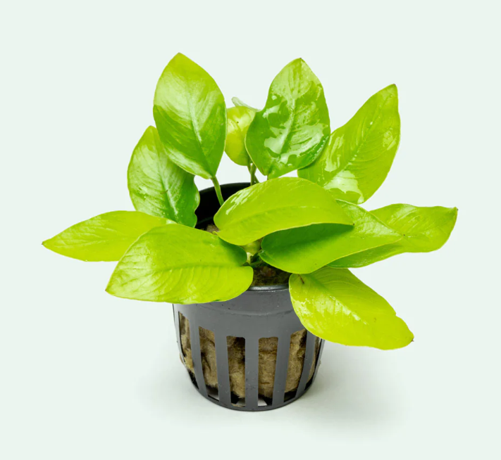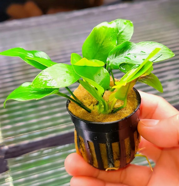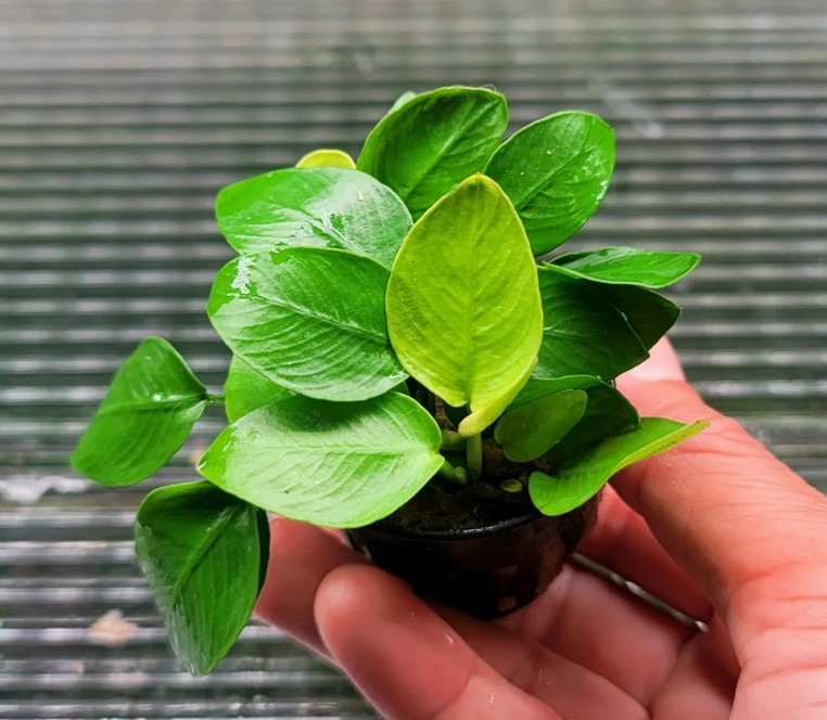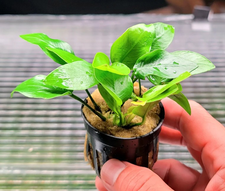 • Главная особенность: самый светлый и контрастный из карликовых анубиасов. Молодые листья имеют яркую золотисто-жёлтую или салатовую окраску, которая с возрастом постепенно темнеет до светло зелёной, создавая красивый градиент в кусте. Очень медленнорастущий, идеален для создания цветовых акцентов на переднем и среднем плане аквариума.
