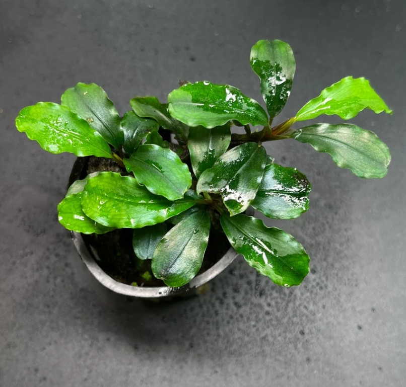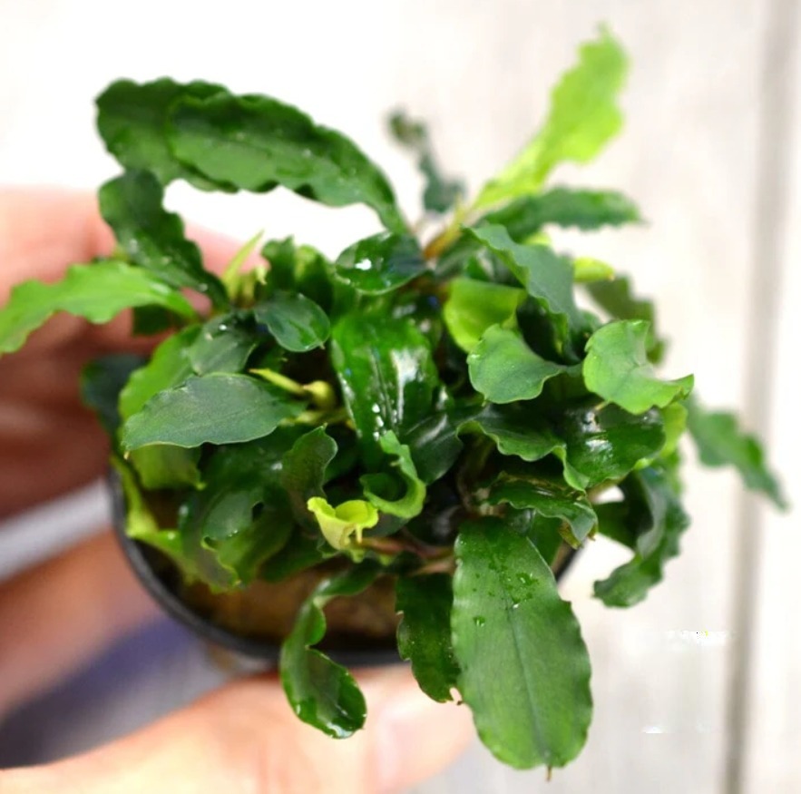 Буцефаландра «Зеленая Волна» — это изысканное и медленнорастущее растение с острова Борнео, ставшее одним из первых культивируемых видов буцефаландры в аквариумистике . Его главное украшение — плотные, ярко-зеленые листья с характерным волнистым краем, напоминающим морскую волну. Листовые пластины достигают длины 5 см и ширины 2 см, на них часто заметны мелкие серебристые или белые крапинки, придающие растению благородный блеск . Благодаря ползучему корневищу и склонности к ветвлению даже без обрезки, оно формирует красивый, плотный кустик, который великолепно смотрится на корягах и камнях.