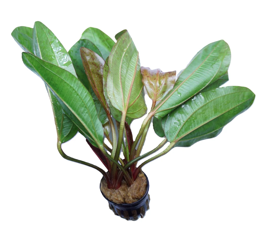 Эхинодорус Шлютера — это яркий и популярный селекционный гибрид, сочетающий в себе неприхотливость и декоративную привлекательность. Его главная особенность — красивая окраска листьев: молодые листочки появляются нежно-розовыми или лососево-красными, а по мере взросления приобретают насыщенный оливково-зелёный цвет с контрастными красноватыми прожилками. Листья овально-сердцевидные, с волнистым краем, формируют пышную, но невысокую розетку. Это растение идеально подходит для создания цветового акцента на среднем плане.