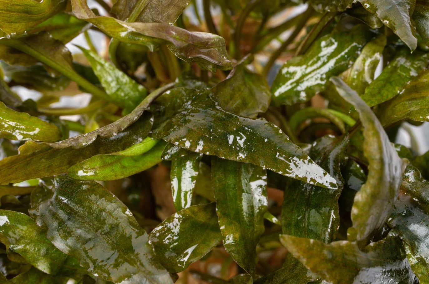 Криптокорина Вендта Тропика — это привлекательный и выносливый селекционный гибрид, сочетающий в себе лучшие декоративные качества. Её листья ланцетовидной или овальной формы с волнистым краем, окрашены в сочный зелёный цвет, часто с привлекательным коричневатым или бронзовым узором вдоль центральной прожилки и краёв. Растение образует пышную, но компактную розетку средней высоты, которая быстро разрастается, формируя плотные и нарядные заросли. Идеально подходит для создания густых групп на среднем плане аквариума.