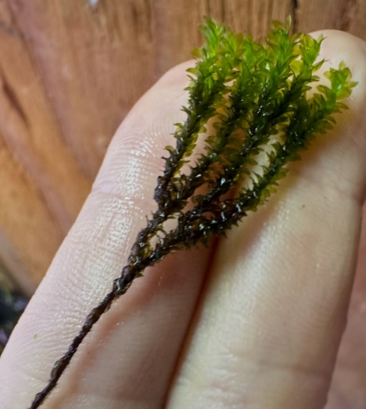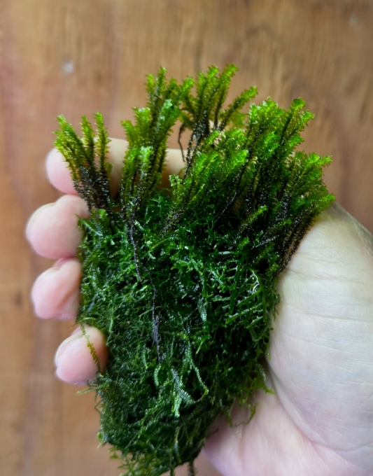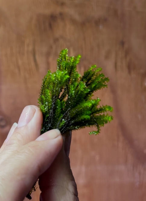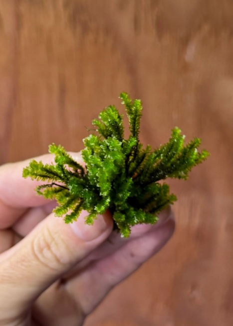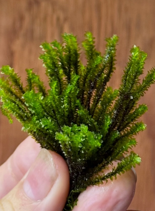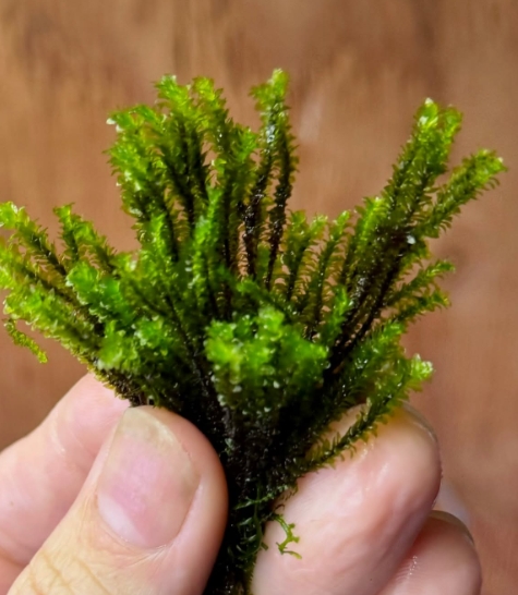 Мох Майбарай (Distichophyllum maibarae) — это настоящий аристократ среди аквариумных мхов, принадлежащий к семейству Daltoniaceae. В отличие от привычных нам «лесных» мхов, этот вид обладает уникальной, почти суккулентной структурой: его листья плотные, округлые и расположены строго в двух плоскостях вдоль стебля. В аквариуме он формирует невероятно аккуратные, плоские и жесткие веточки ярко-изумрудного цвета, которые выглядят так, будто их вырезали из тонкого пластика или воска. Это идеальное растение для тех, кто ищет безупречную геометрию и эксклюзивность.