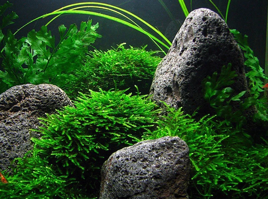 Мох павлиний, или Пикок (Taxiphyllum sp. 'Peacock'), — один из самых красивых и узнаваемых перистых мхов. Свое название он получил благодаря уникальному строению веточек: они очень густые, симметричные и широкие, что делает их похожими на миниатюрные перья из хвоста павлина. В аквариуме этот мох формирует плотные, бархатистые подушки изумрудного цвета с синеватым отливом, которые выглядят необычайно пышно и декоративно. Это растение ценится акваскейперами за способность создавать мягкие, глубокие текстуры, которые мгновенно притягивают взгляд.