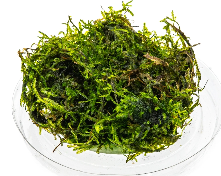Павлиний мох наиболее гармонично сочетается с ветвистыми корягами типа «паучий корень» и темными фактурными камнями. Его широкая, перистая фактура создает превосходный визуальный контраст с тонкими иглами элеохариса и гладкими листьями мелких анубиасов, подчеркивая природную детализацию среднего плана.