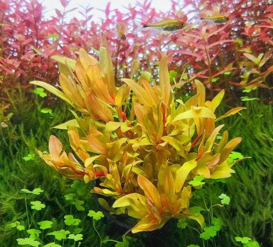Низея золотая — это удивительное аквариумное растение, которое привносит в подводный сад яркие солнечные краски. Её главная особенность — листья насыщенного золотисто-жёлтого цвета, которые создают потрясающий контраст с традиционными зелёными растениями. Это стеблевое растение родом из Танзании и Мозамбика, где оно растёт на влажных илистых берегах и в мелких водоёмах. Высота куста может достигать 40 см, что делает его идеальным кандидатом для создания яркого фокуса на среднем или заднем плане аквариума.