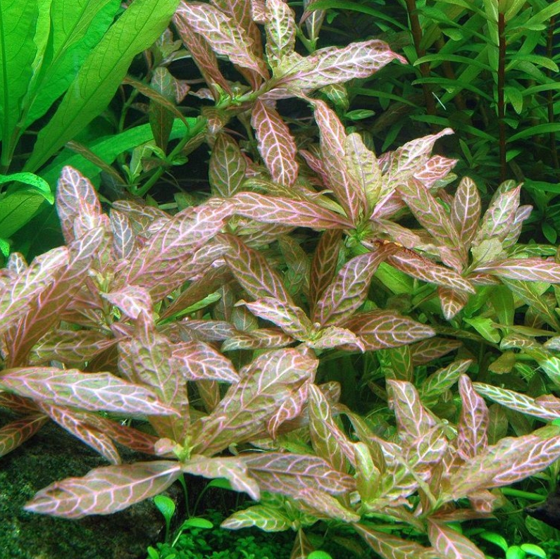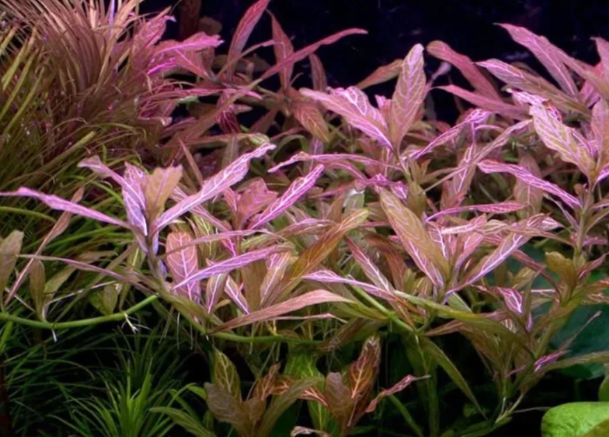 Гигрофила узорчатая розовая (Hygrophila polysperma 'Rosanervig') — это селекционная форма известной гигрофилы многосемянной, которая выделяется на фоне других аквариумных растений необычной окраской . Её главная особенность — контрастные белые, розовые или кремовые прожилки, которые создают на листовых пластинах эффектный «мраморный» или сетчатый узор . При интенсивном освещении верхушки растения окрашиваются в насыщенные розово-красные тона, что делает его одним из самых ярких и доступных цветовых акцентов для аквариума .
