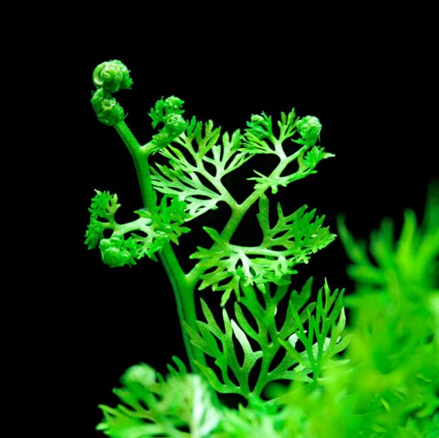 Индийский папоротник — это популярное, плавающее или укореняющееся в грунте растение с ажурной, светло-зелёной листвой, напоминающей укроп или морковную ботву. Его листья (вайи) сильно рассечены, мягкие и нежные на ощупь. Растение может свободно плавать на поверхности, образуя красивые розетки, или быть посаженным в грунт, где формирует пышный куст. Оно быстро растёт, эффективно поглощает избыток питательных веществ и служит отличным укрытием для мальков.