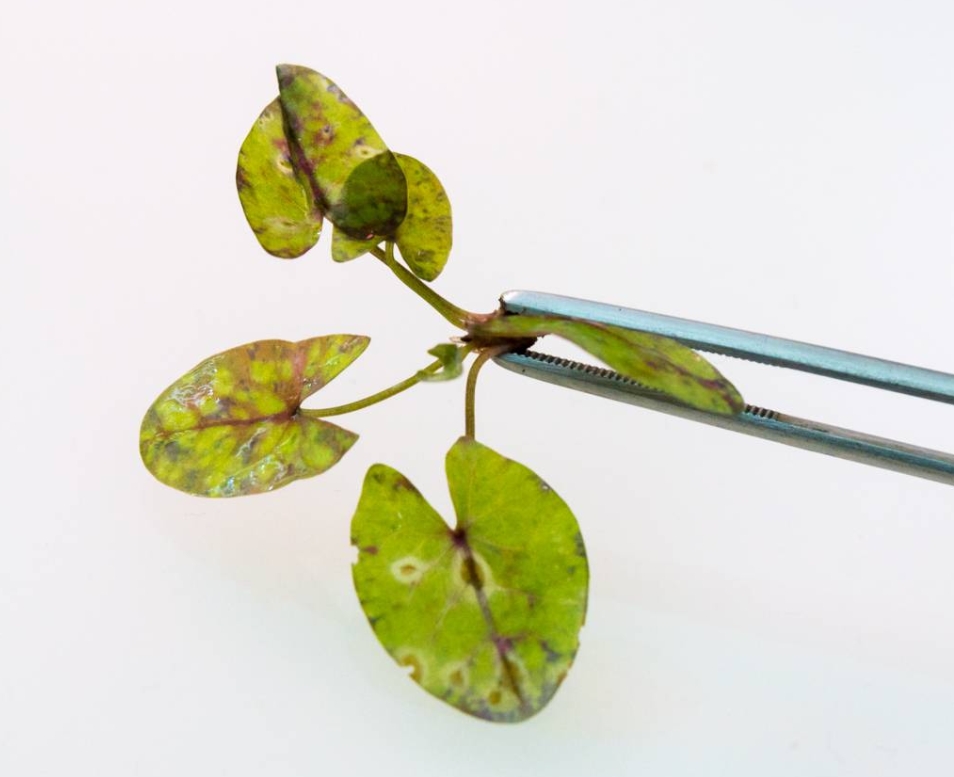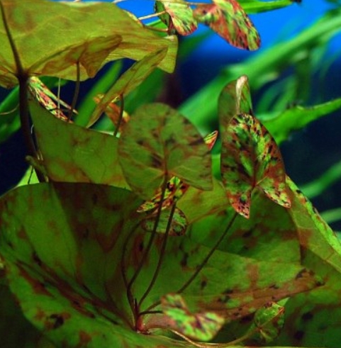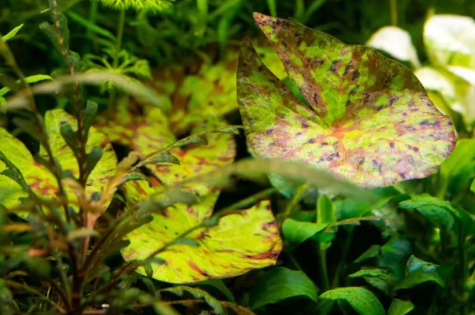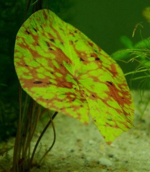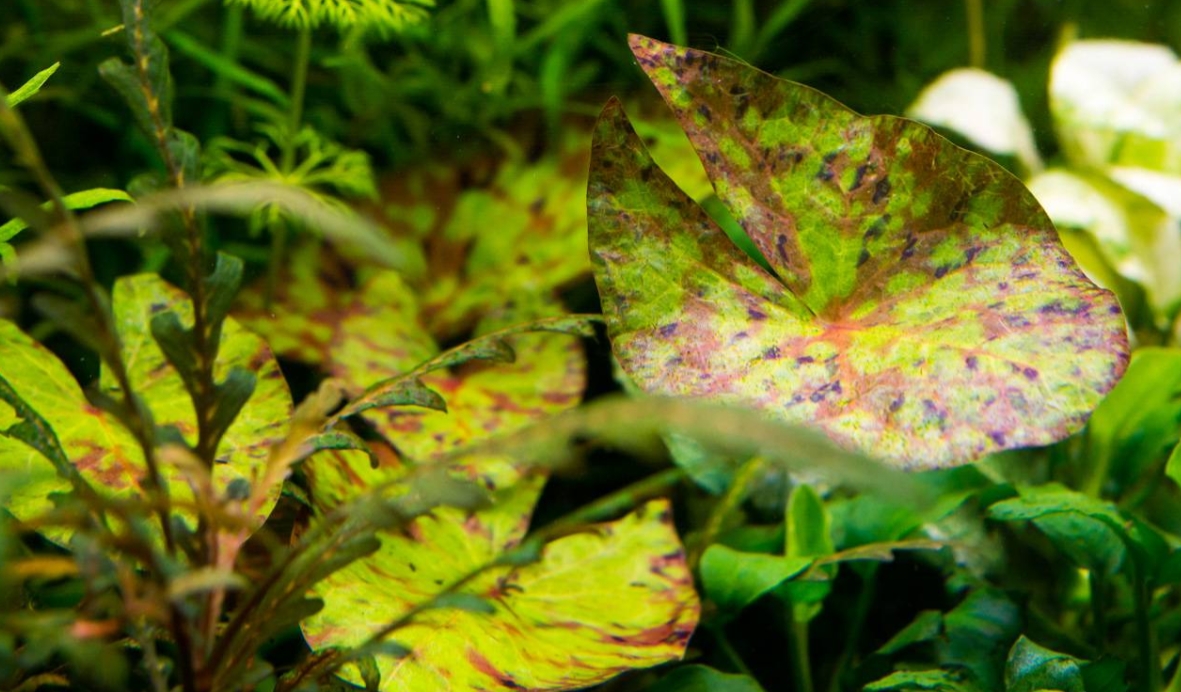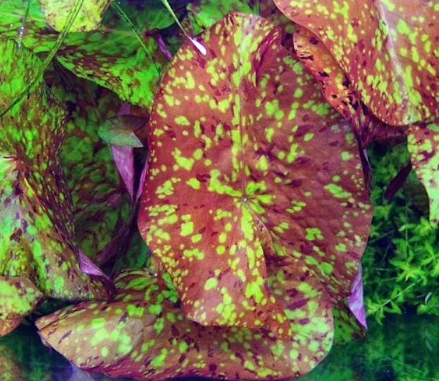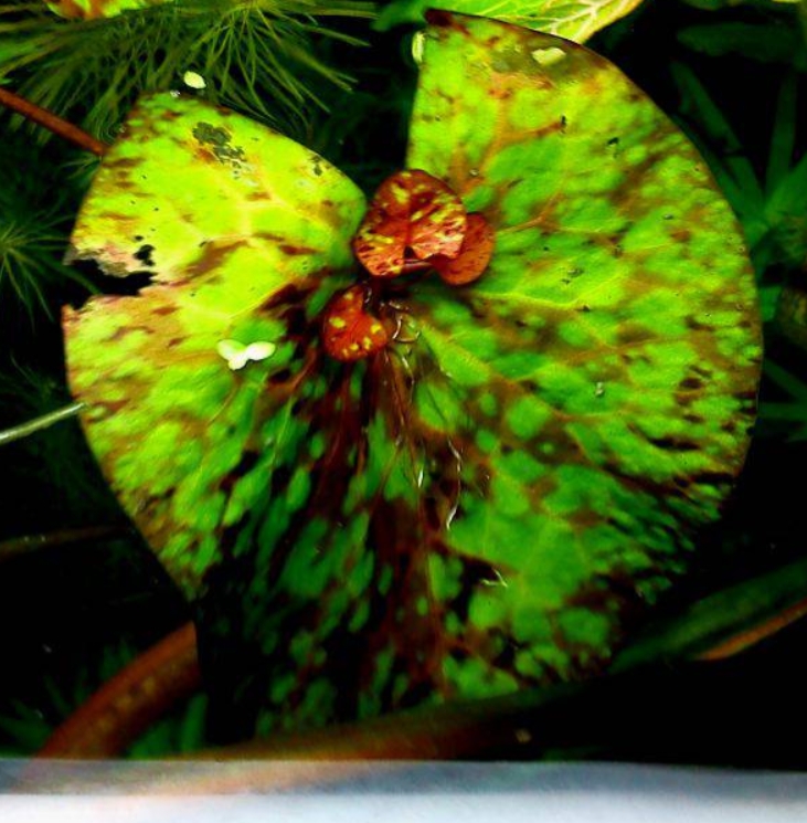 Нимфея микранта (Nymphaea micrantha) — это одно из самых очаровательных и необычных розеточных растений в семействе кувшинковых. Ее часто называют «живородящей нимфеей» из-за уникальной способности формировать крошечные дочерние растения прямо в центре листовой пластины. Листья микранты обладают потрясающим пятнистым рисунком: на оливково-зеленом фоне хаотично разбросаны контрастные красно-коричневые штрихи и пятна, что создает эффект «камуфляжа» и делает каждый куст неповторимым.