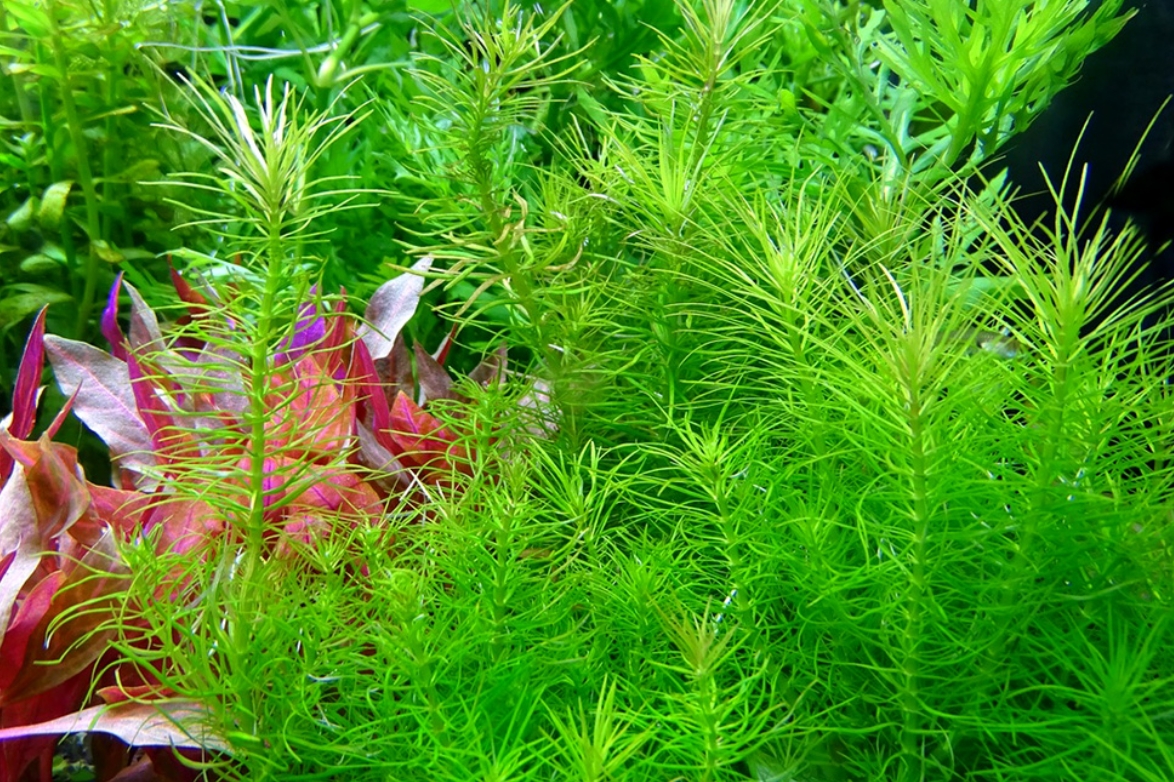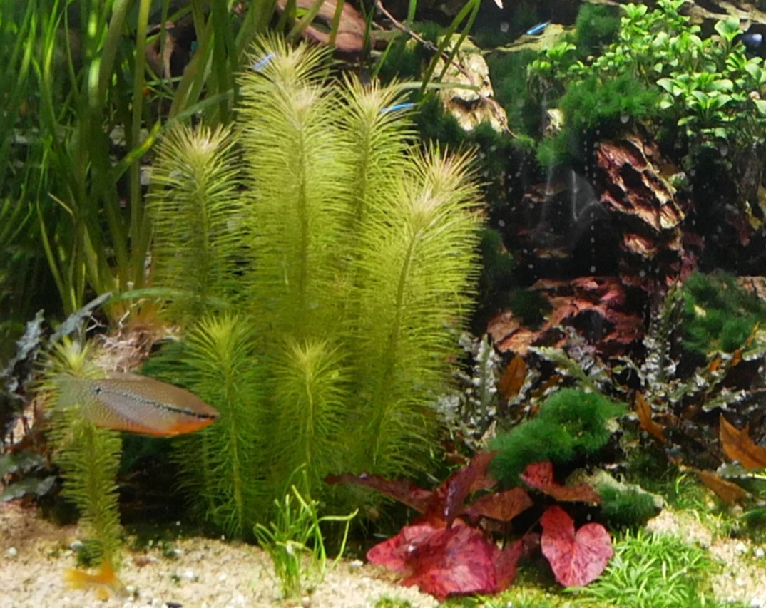 Погостемон эректус (Pogostemon erectus) — это уникальное длинностебельное растение, которое своим внешним видом больше напоминает миниатюрную хвойную веточку или пушистый хвощ, чем классического обитателя тропических вод. Его узкие, игольчатые листья ярко-изумрудного цвета собраны в очень плотные мутовки на жестком вертикальном стебле. В аквариуме он формирует строгие, идеально ровные и густые группы, которые выглядят невероятно аккуратно и архитектурно, создавая эффект сказочного подводного леса.