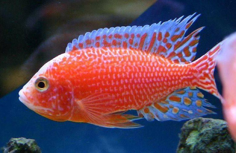 - Окраска. У взрослых особей тело окрашено в розовые, красные или оранжевые оттенки, может быть равномерным или пятнистым. Между пятнами чешуя обычно голубая, как и на крапчатых плавниках. Самки обычно серые.