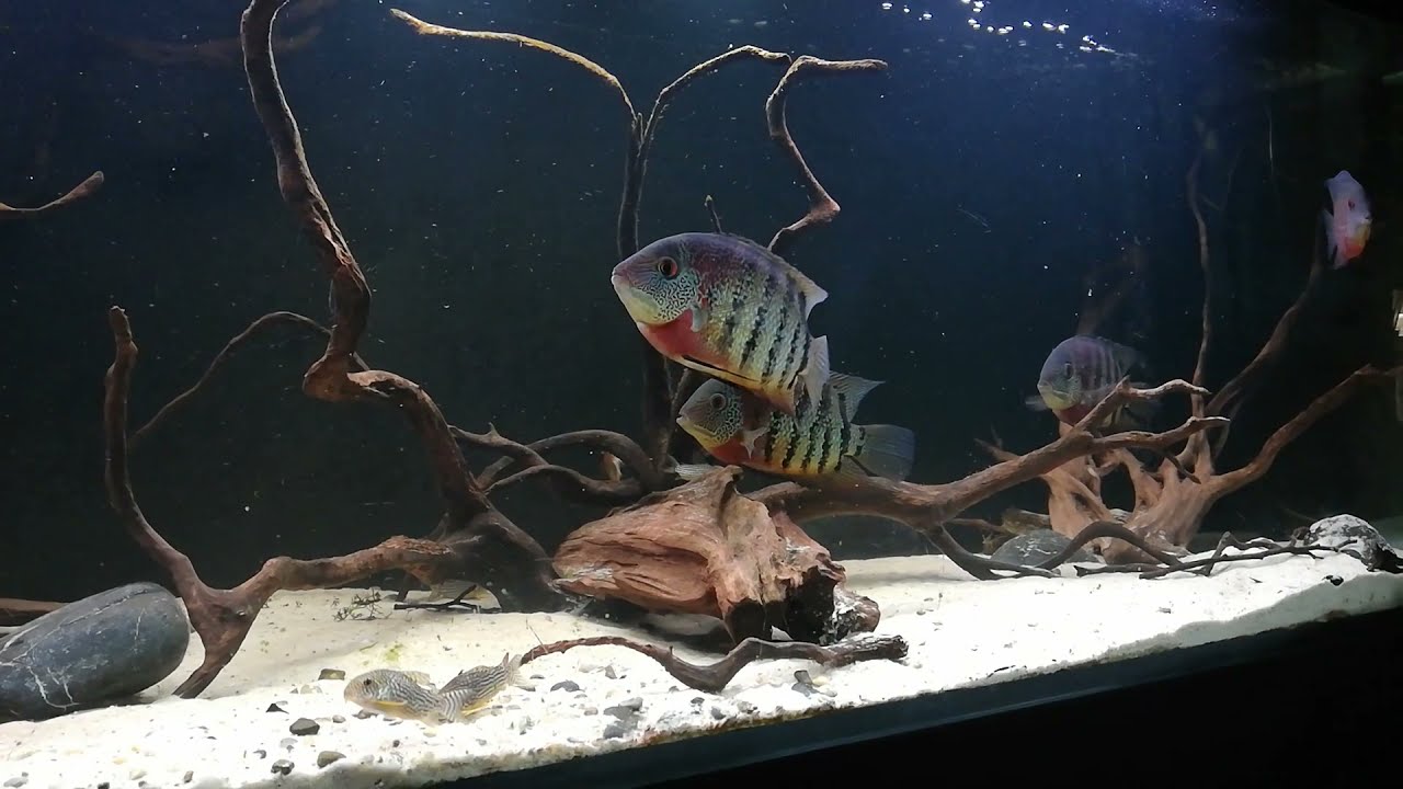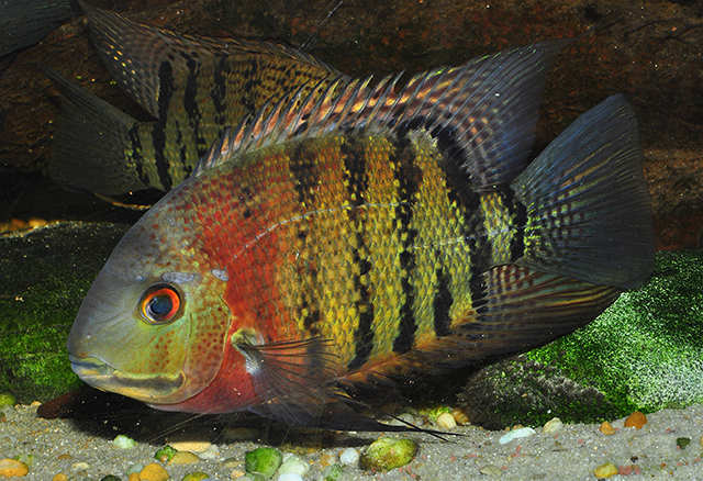 - Растения: цихлазома северум неравнодушна к зелени и обычно быстро её уничтожает. Выстоять под её напором смогут разве что жестколистные виды с развитой корневой системой — и при условии, что корни защищены валунами.