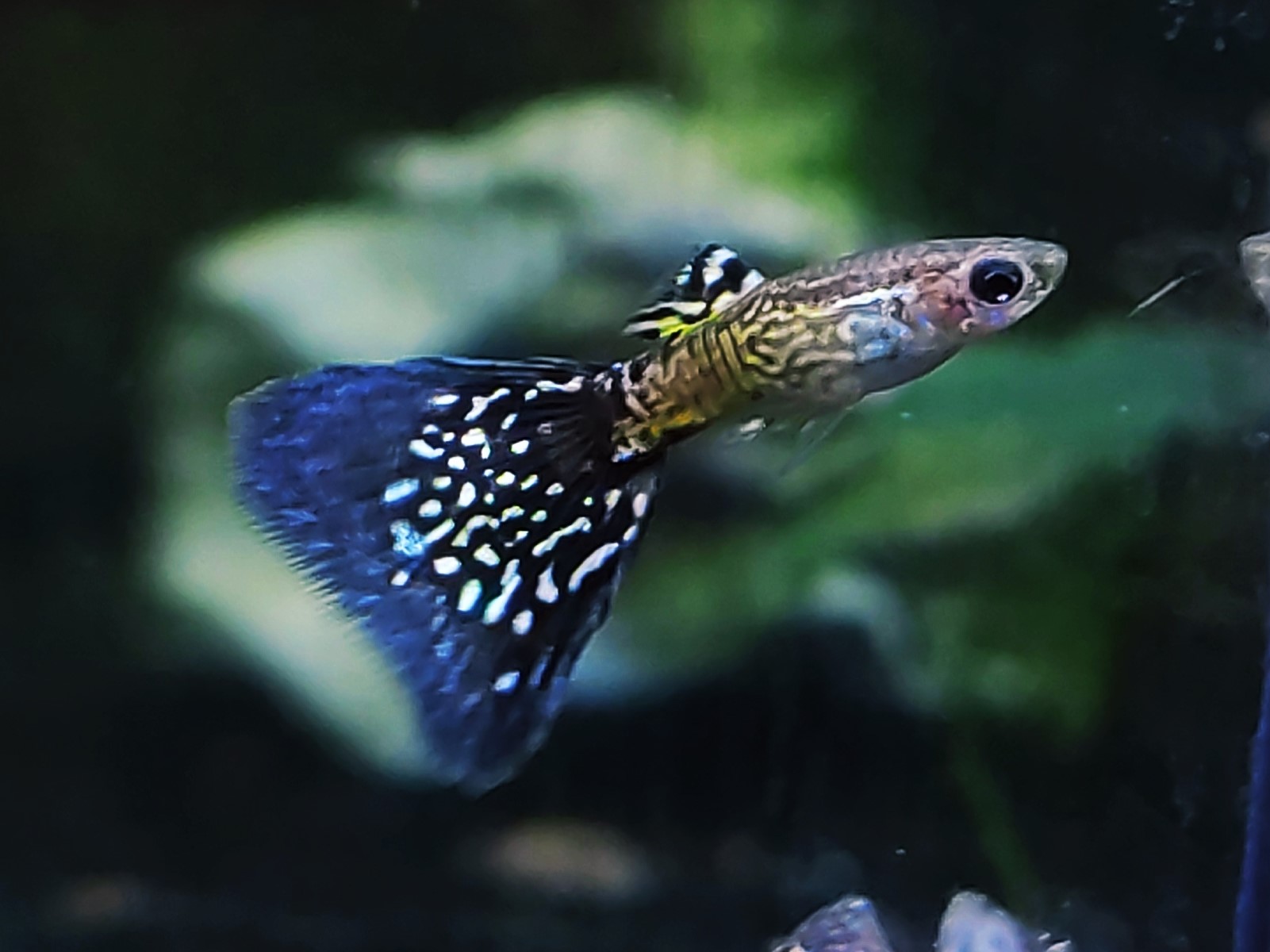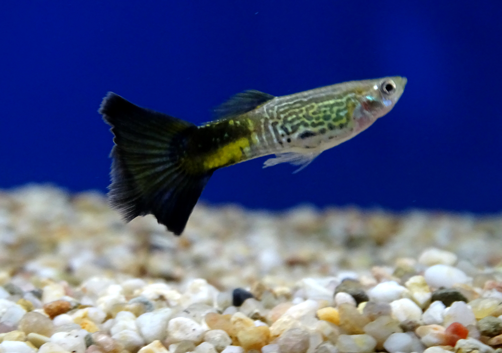 - Форма тела: самцы обладают крупным веерообразным хвостовым плавником, который может иметь разную форму. На хвостовом плавнике часто присутствует узор из многочисленных крапинок и пятен.