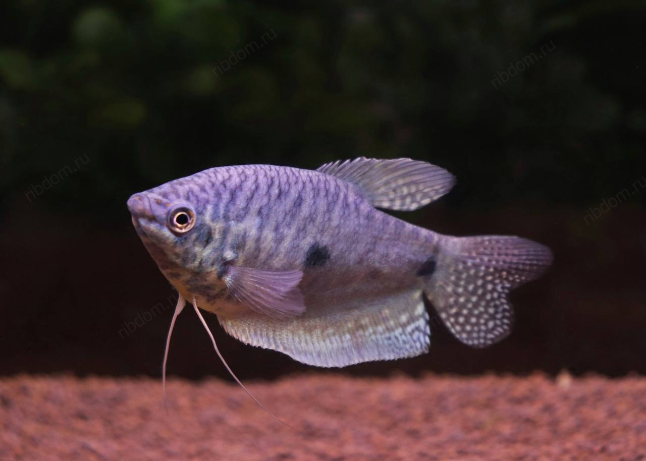 Гурами мраморный (Trichopodus trichopterus “Marble Gourami”) — крупная и эффектная аквариумная рыбка с серебристо-голубым телом, покрытым контрастными тёмными пятнами, напоминающими мраморный узор. Мирный и неприхотливый вид.