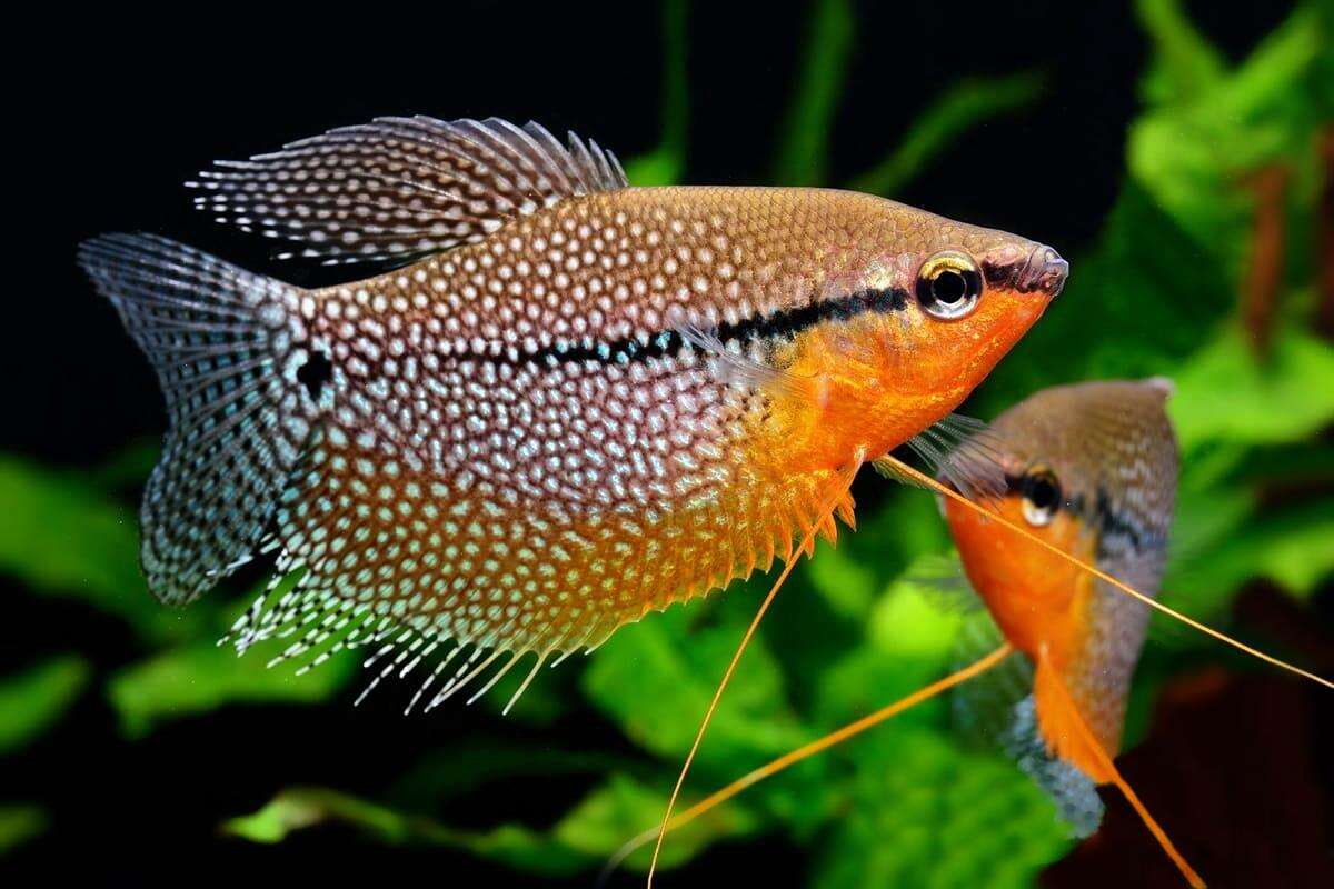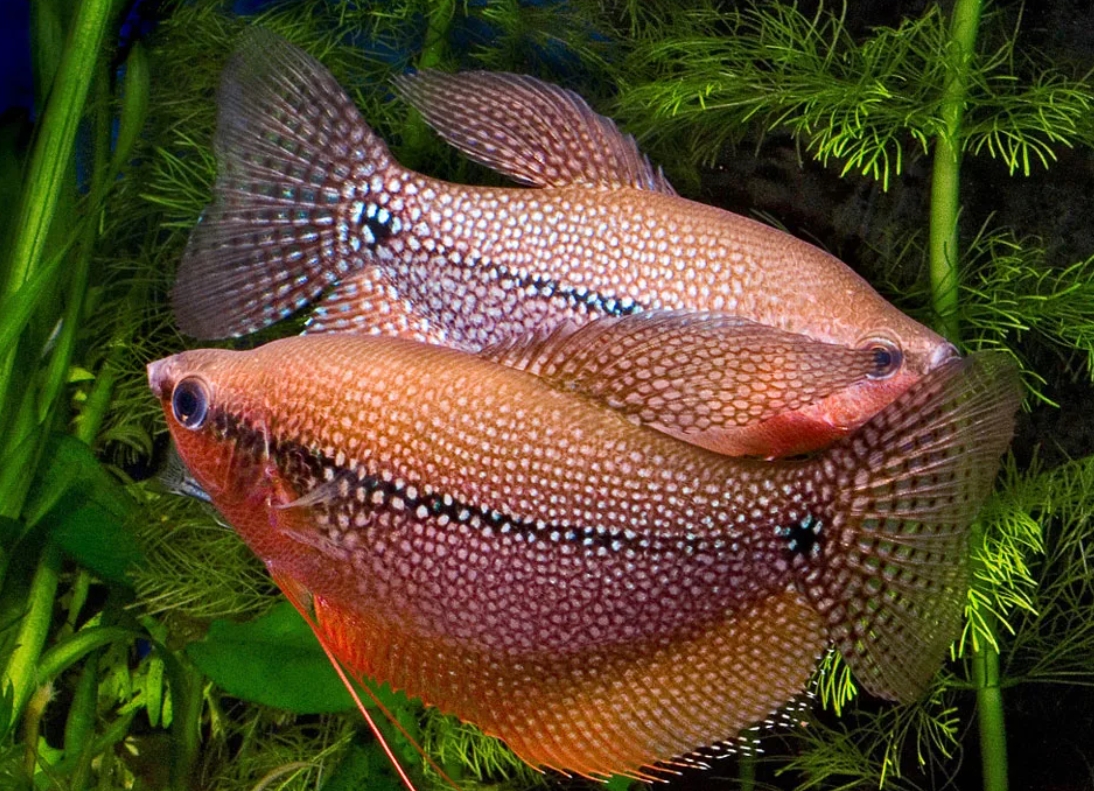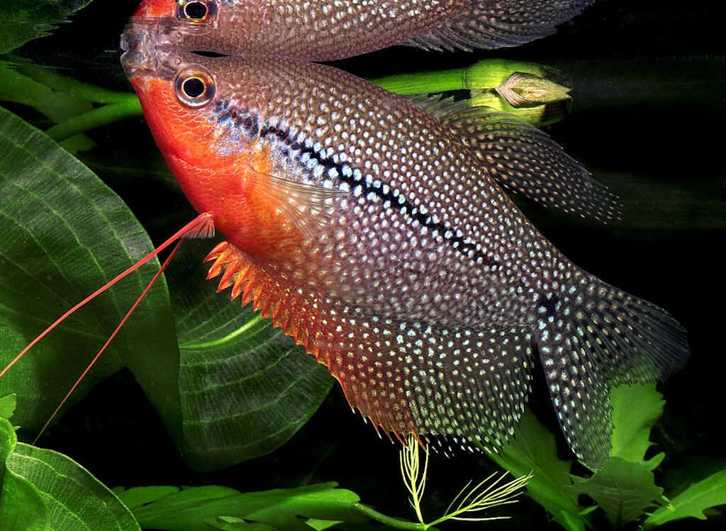 Совместимость: обычно гурами жемчужный спокойно относится к соседям по аквариуму, даже в период нереста. Хорошими соседями станут расборы, неоны, тетры, спокойные скалярии. Не рекомендуется сажать с активными рыбками, такими как барбусы — они способны откусывать грудные нитевидные плавники.