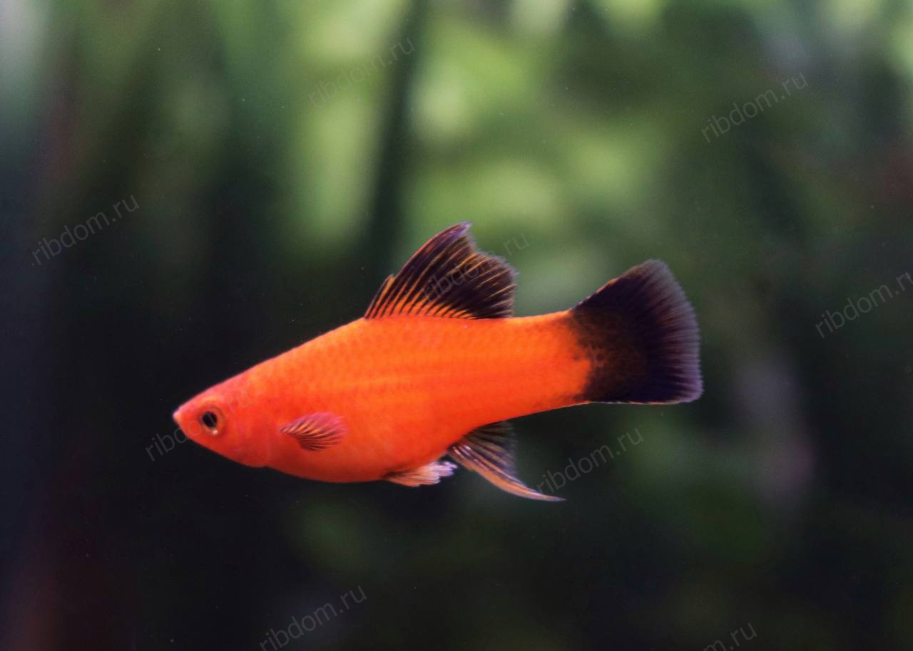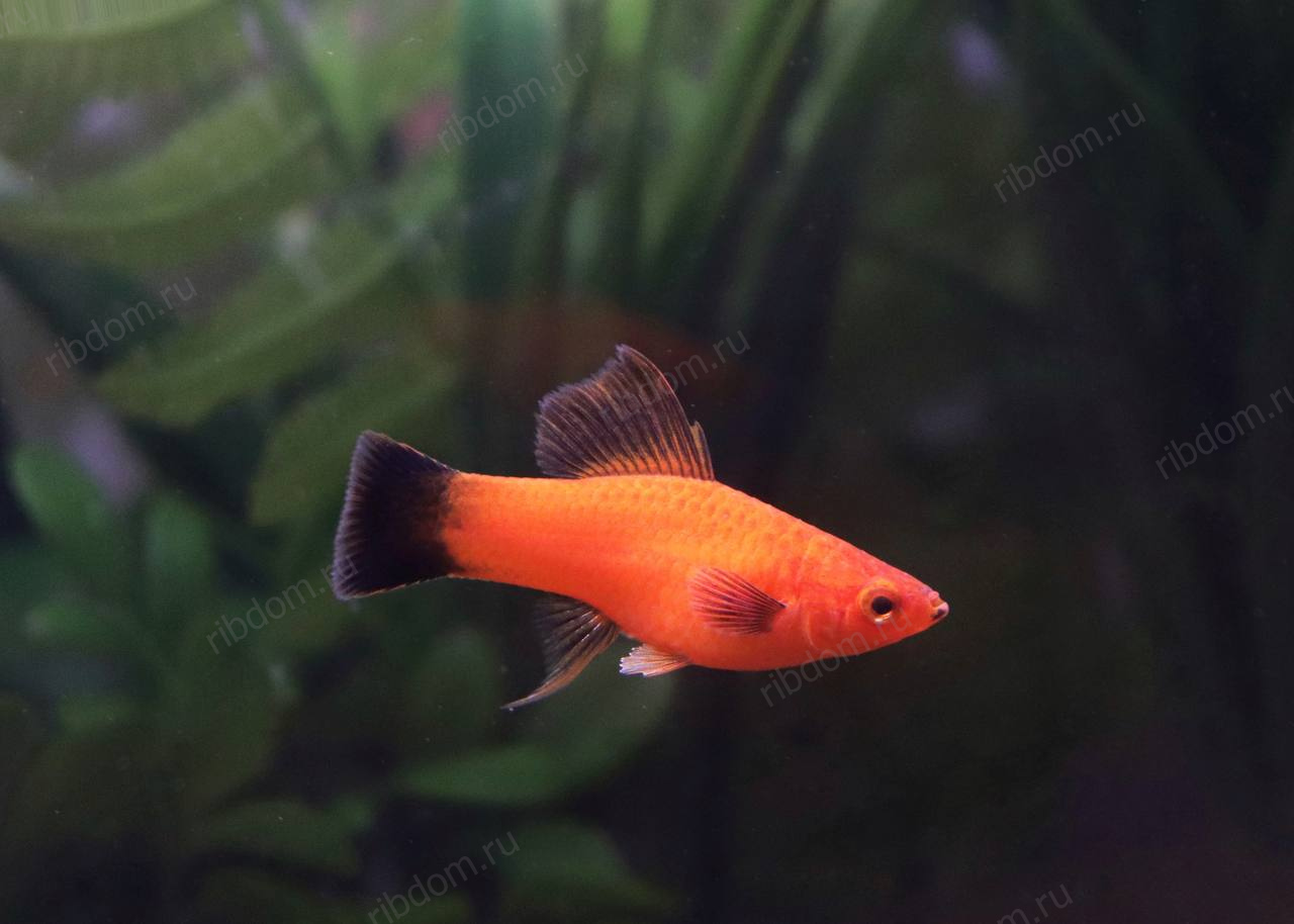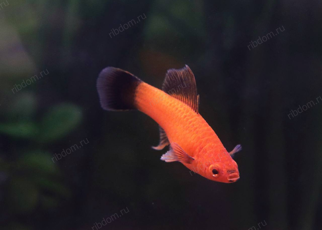 - У самцов — характерный удлинённый нижний хвостовой луч («меч»).