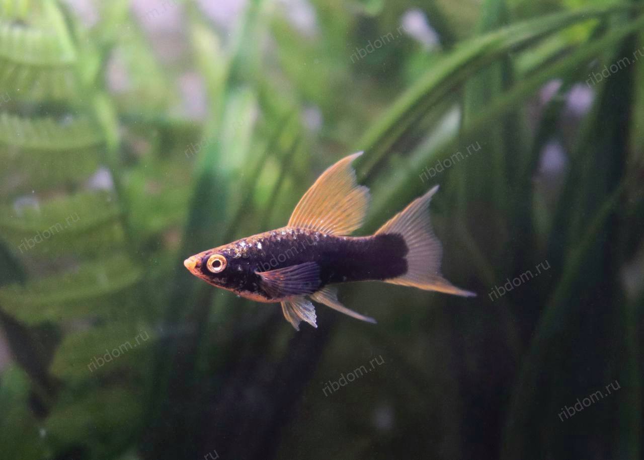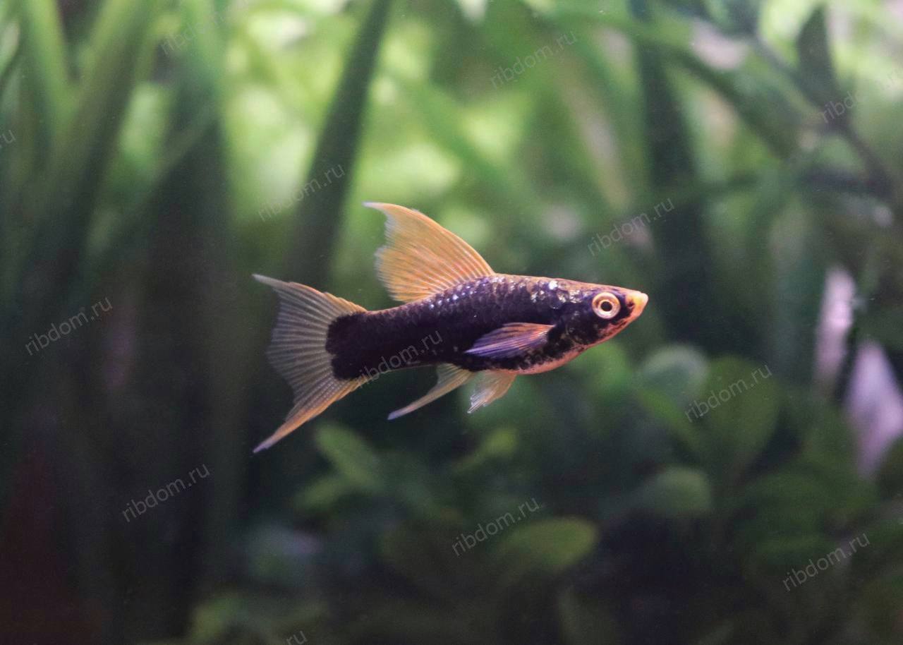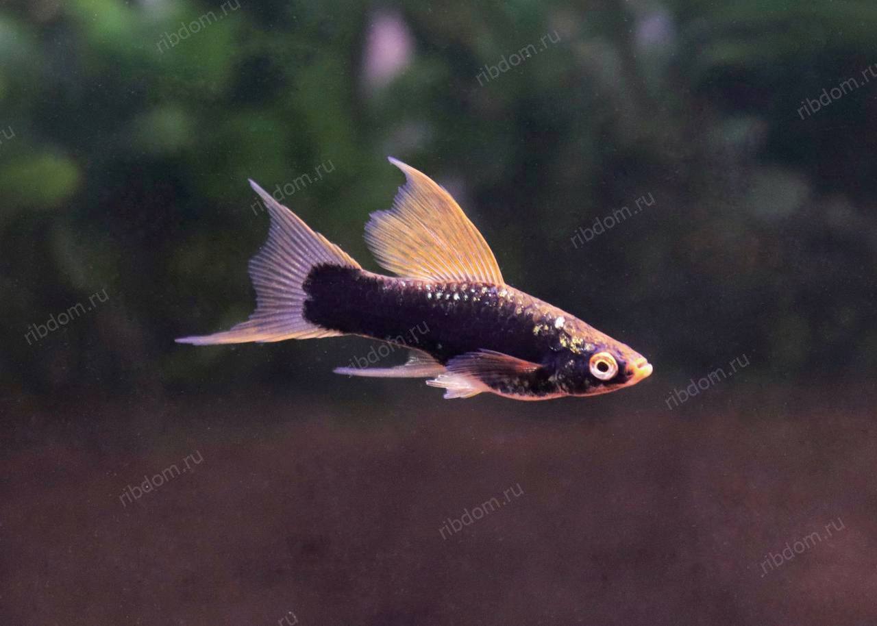 Меченосец чёрный вильчатый (Xiphophorus hellerii “Black Lyretail”) — эффектная форма меченосца с глубоким чёрным окрасом и изящным лировидным хвостом («вилка»). Рыбка привлекает внимание своей необычной формой и элегантностью. Подходит для новичков и опытных аквариумистов.