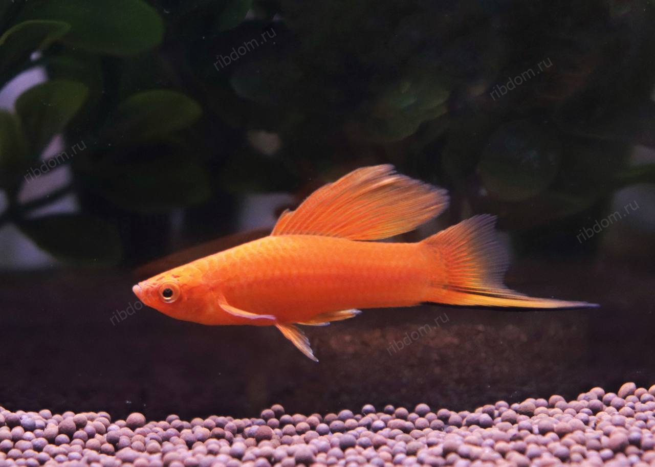 - Самцы стройнее, имеют удлинённый нижний хвостовой луч («меч»), самки — крупнее и массивнее.