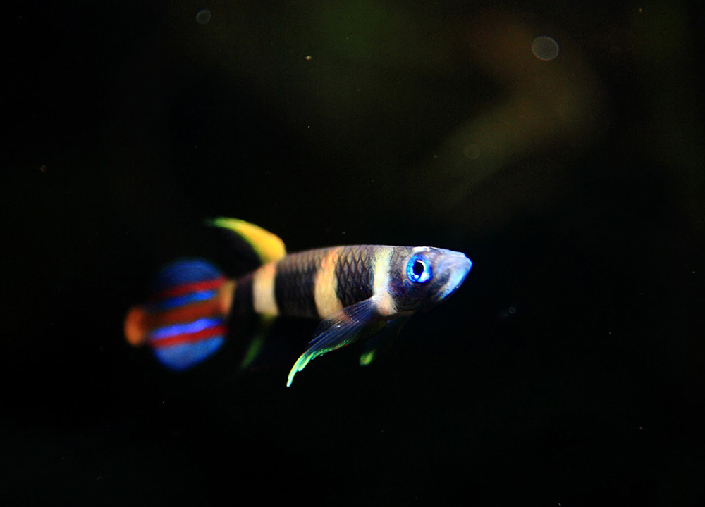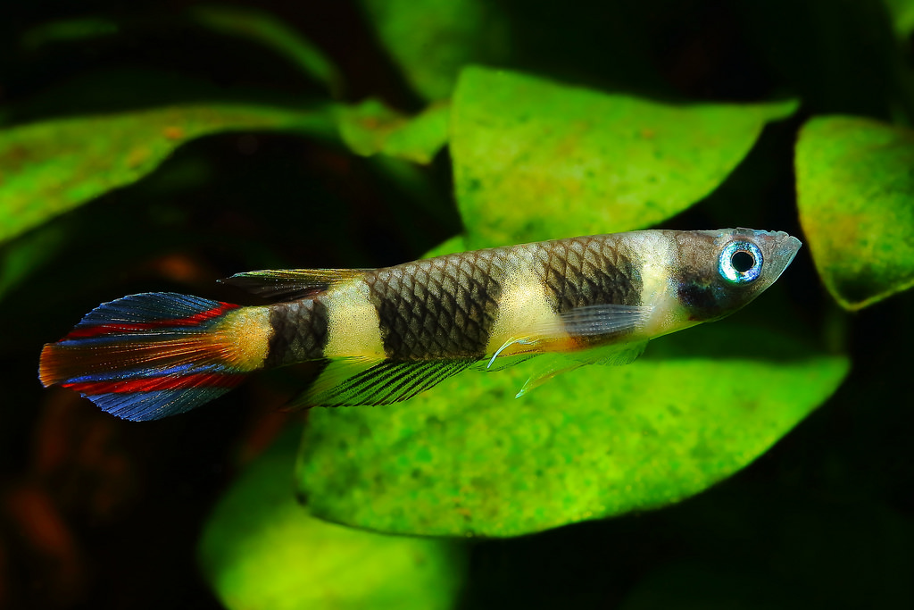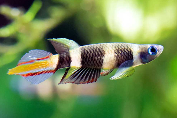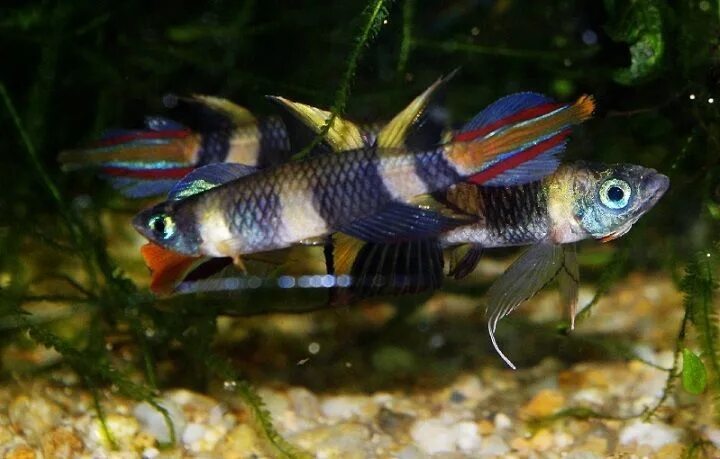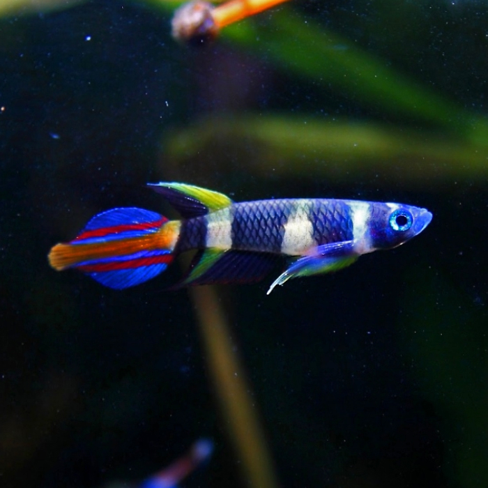 Окрас: по кремовому телу проходят четыре широкие тёмные полосы, а хвост самца переливается ярко-голубым с красными вкраплениями. Радужка глаз также имеет голубой оттенок. Грудные плавники бесцветные. В зависимости от того, в какой африканской речке родились родители рыбки, её цвета могут немного отличаться.