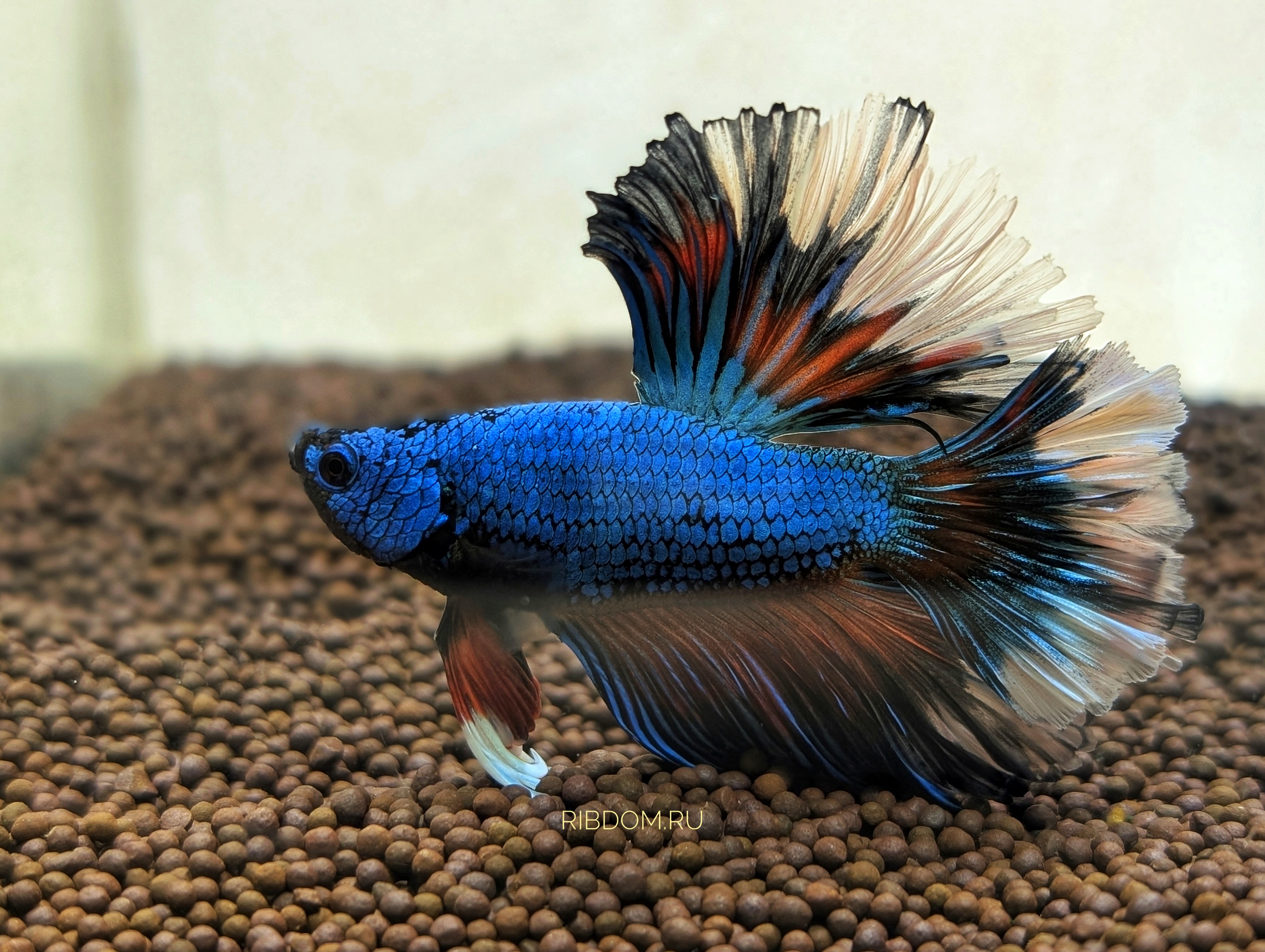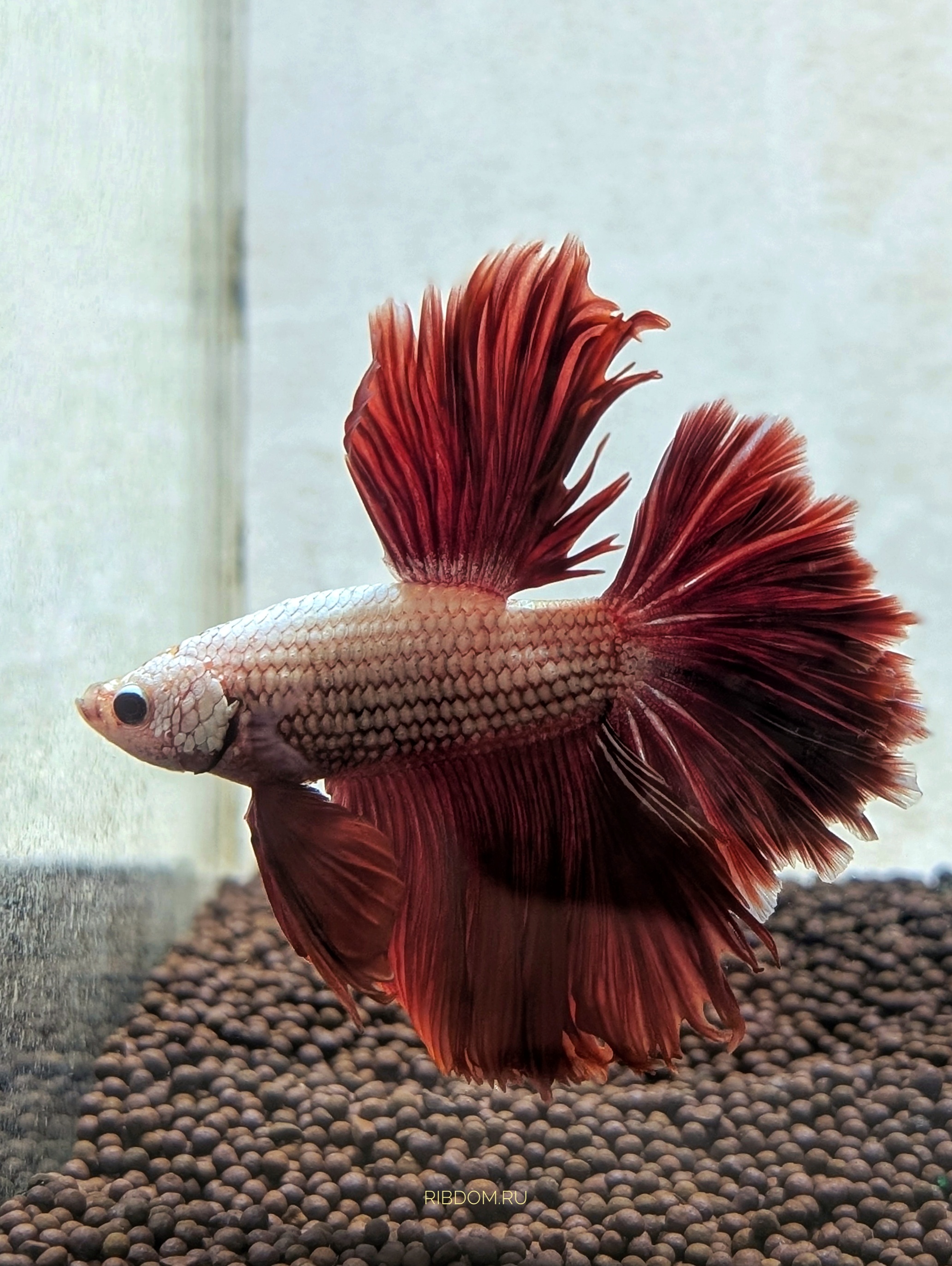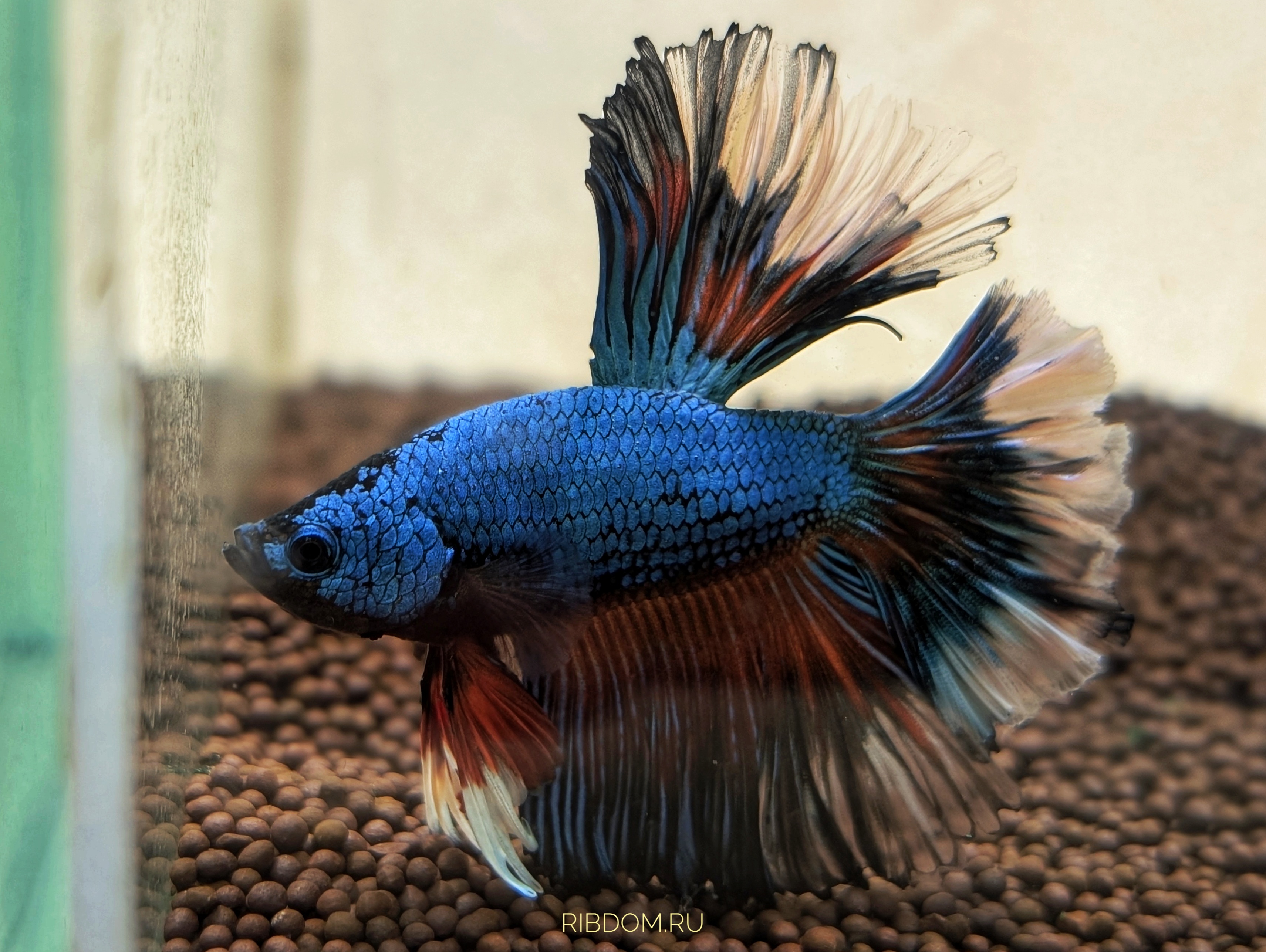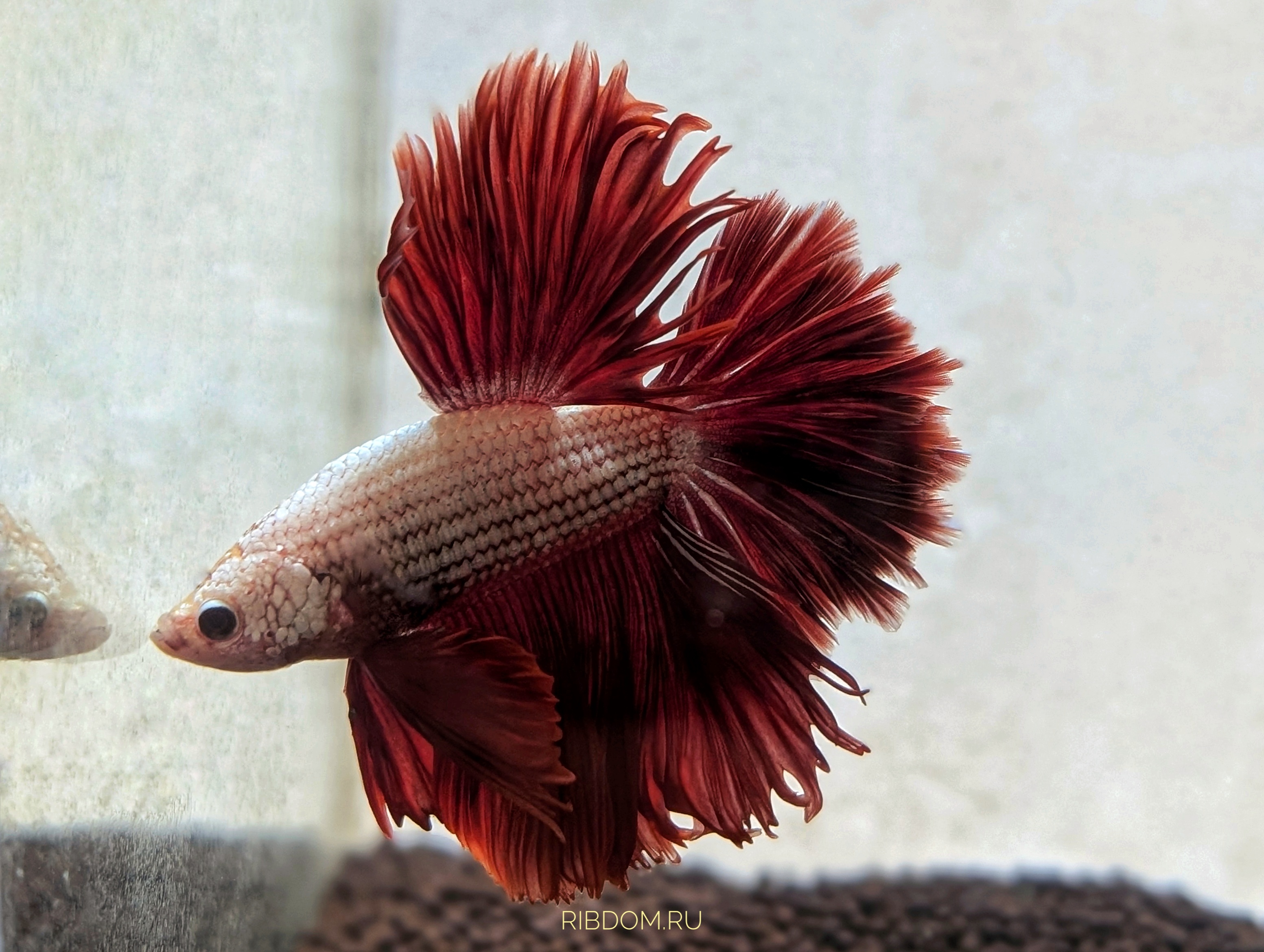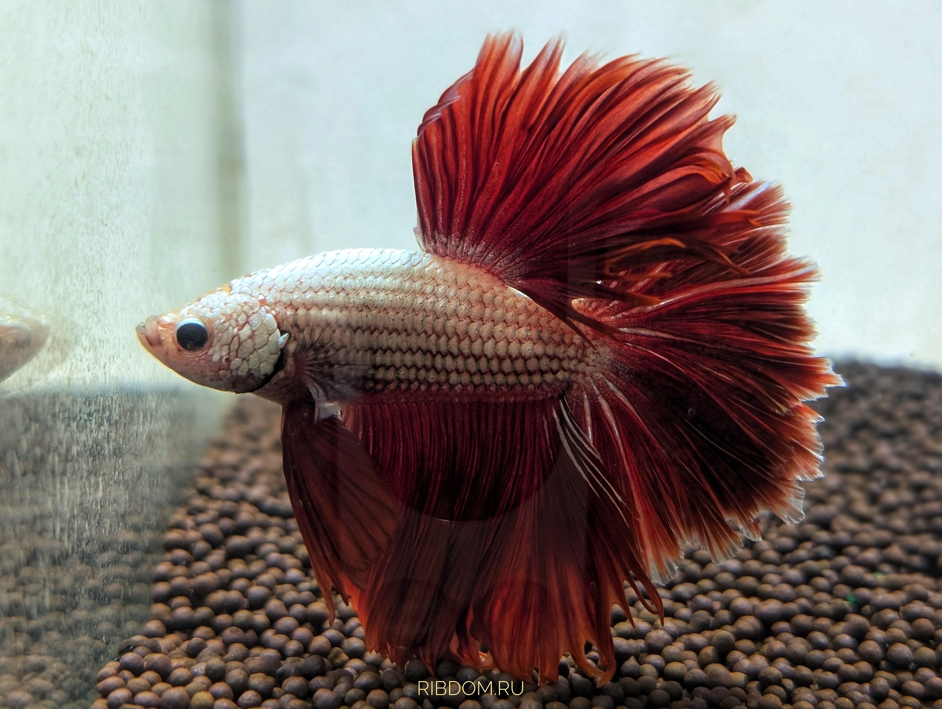 - Окраска: в основном двухцветная, реже одноцветная, но хвостовые плавники всегда ярче цвета тела. В состоянии возбуждения они расправляются на 90 градусов против линии тела, формируя чётко очерченную букву D с ровным окаймлением.