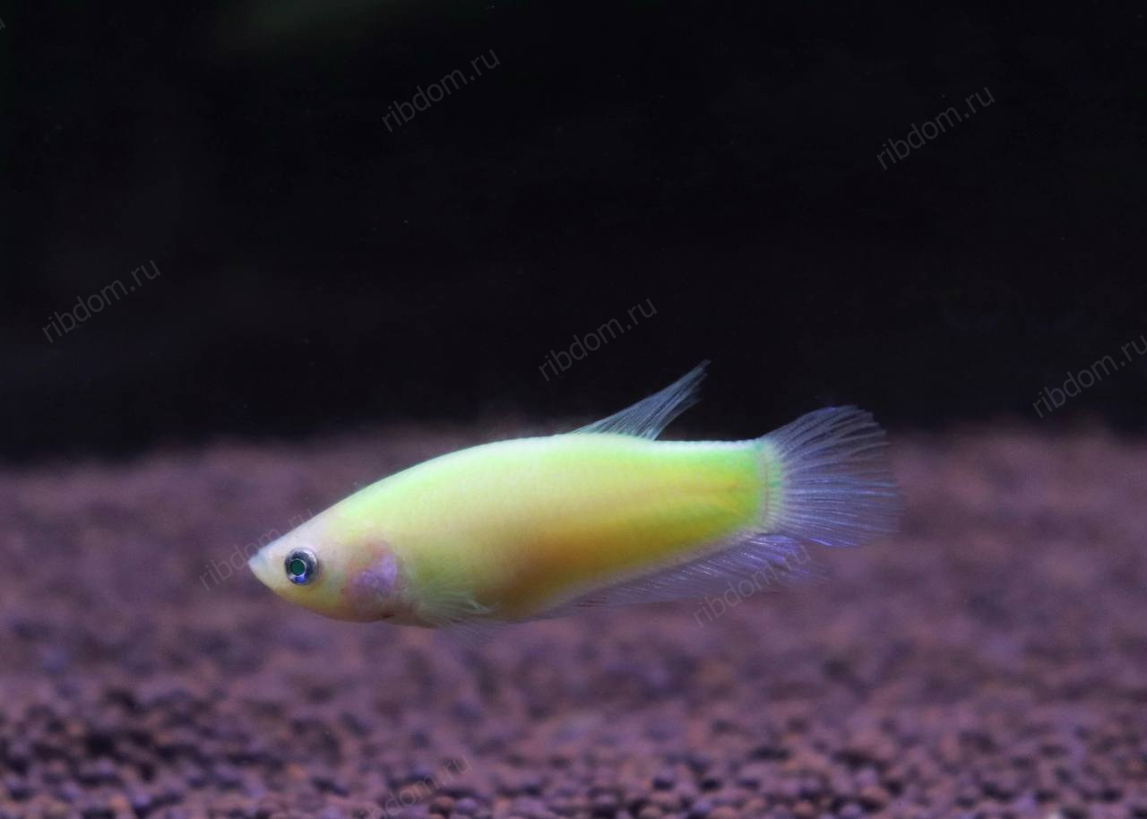 Курочка вуаль Glo (Betta splendens “Veiltail Glo”) — самки петушков вуалевой формы меньше и скромнее окрашены, чем самцы, но в варианте Glo они также имеют яркий неоновый окрас, светящийся под LED или ультрафиолетовой подсветкой.