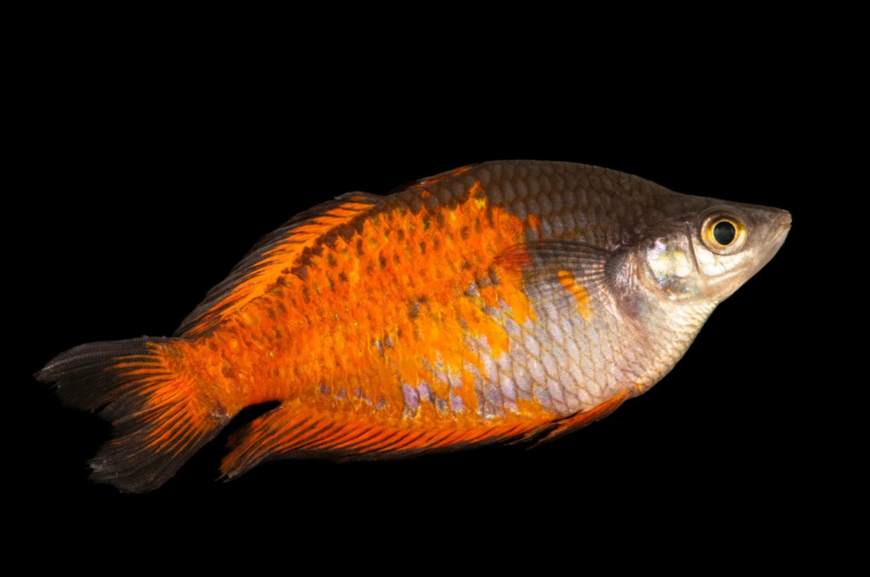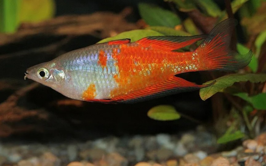 Половой диморфизм: самцы выглядят ярче благодаря красно-оранжевому пигменту, неравномерно покрывающему половину тела со стороны хвоста. Реже встречаются рыбки с желтоватой расцветкой.