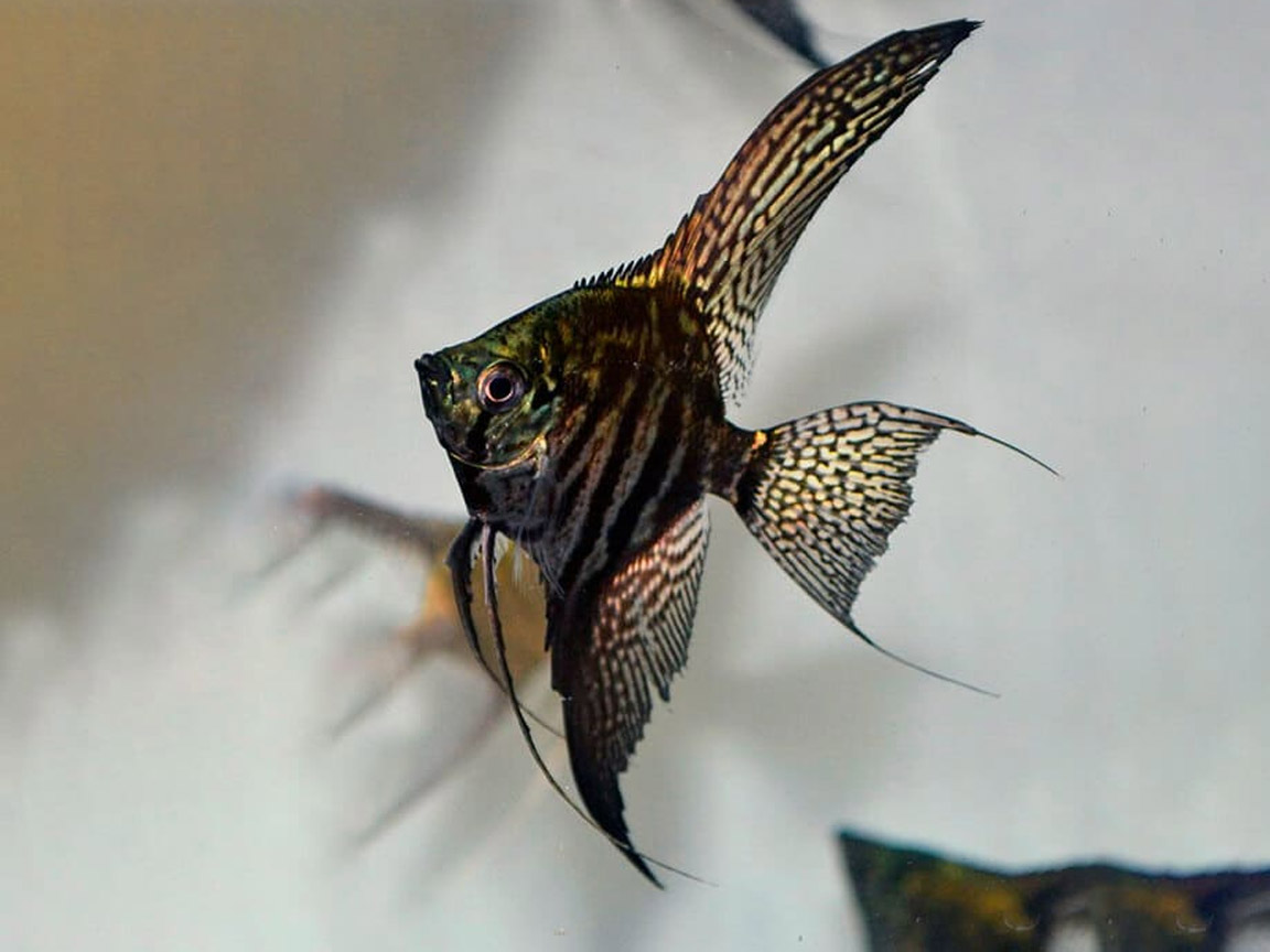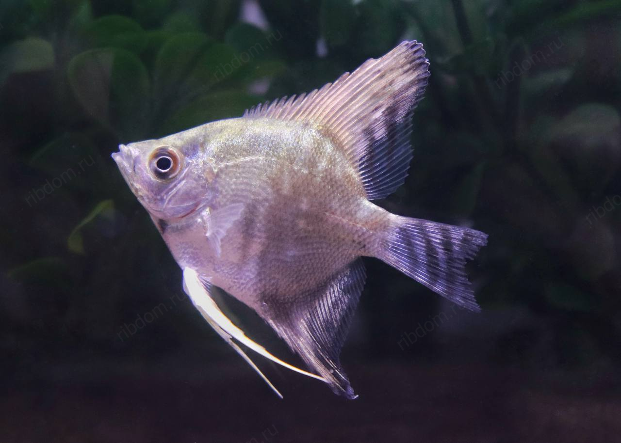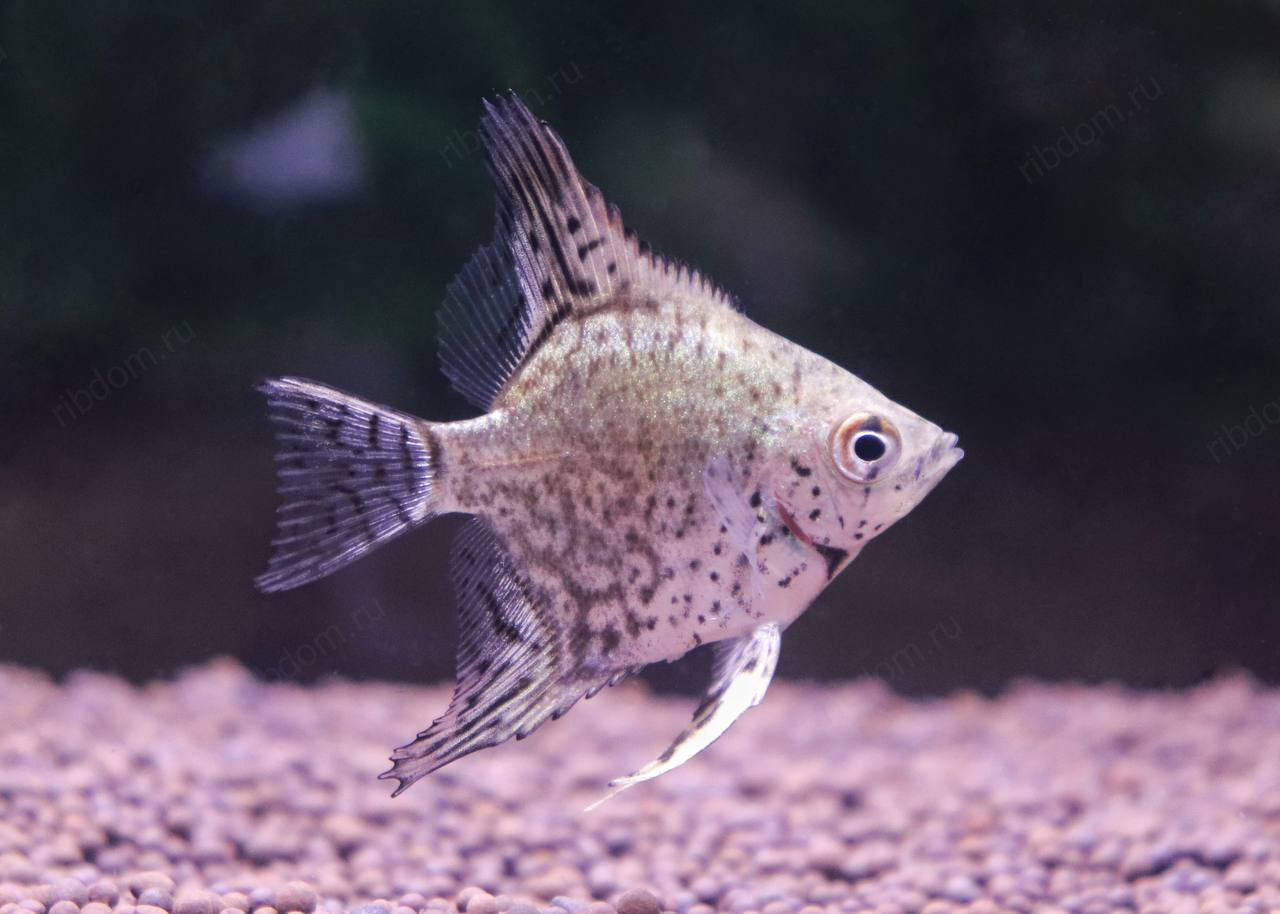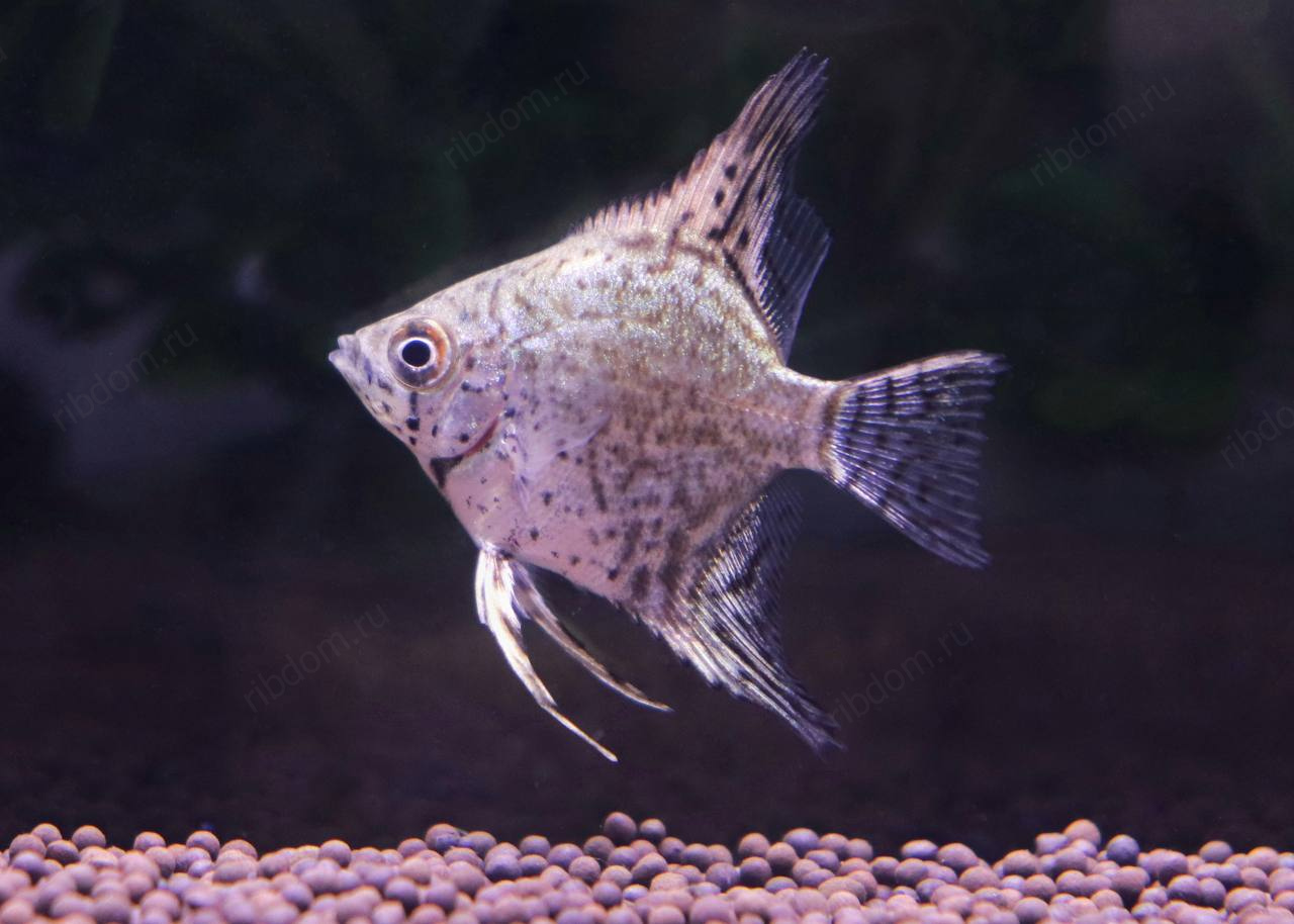 Скалярия Пиной (Pterophyllum scalare “Pinoy”) — одна из самых красивых селекционных форм скалярий. Отличается нежным серебристо-мраморным телом с тёмными вкраплениями и прозрачными плавниками с аккуратными штрихами. Смотрится элегантно и утончённо, особенно в аквариуме с мягким светом.