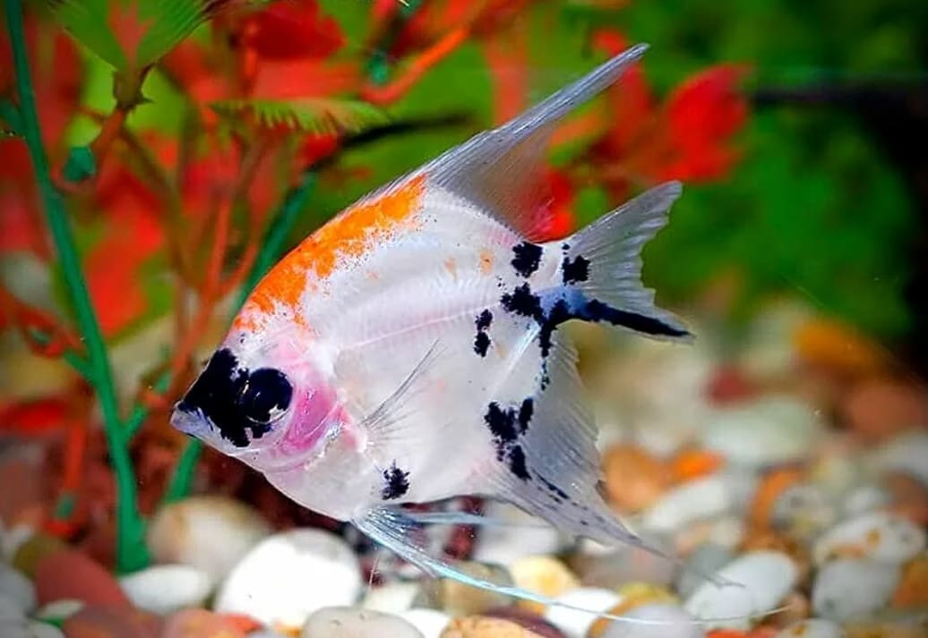 - Основной цвет тела — белый или серебристый. У некоторых особей характерные оранжево-красные пятна на голове и спине. На теле присутствуют чёрные пятна различной формы.