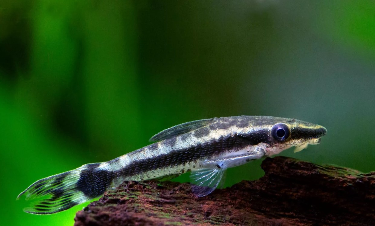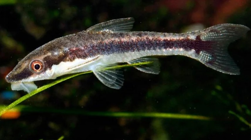 Внешний вид: размер взрослой особи — не более 5 см, основной окрас — белый или золотистый. Через глаза от головы до хвоста проходит широкая тёмная полоска, заканчивающаяся округлым пятном в задней части тела. Всё тело покрывают мелкие костные пластинки. Рот-присоска позволяет удерживаться на поверхностях и соскребать водоросли.