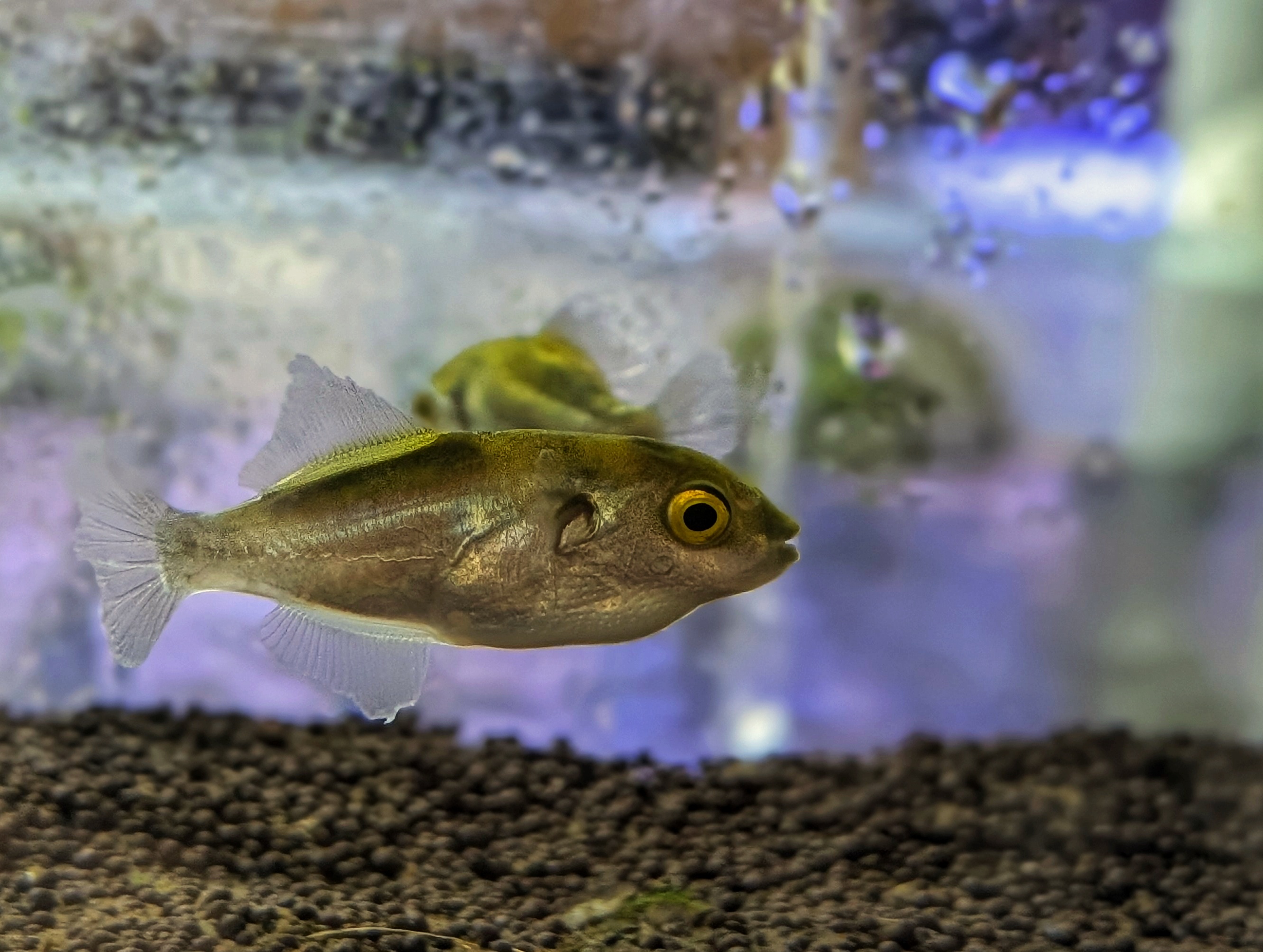 Важно: золотые тетраодоны демонстрируют сложное социальное поведение — в группе формируется чёткая иерархия, поэтому содержать следует не менее 3–4 особей. Рыбы проявляют выраженную индивидуальность — они узнают хозяина, могут выпрашивать корм и проявлять элементы игрового поведения.