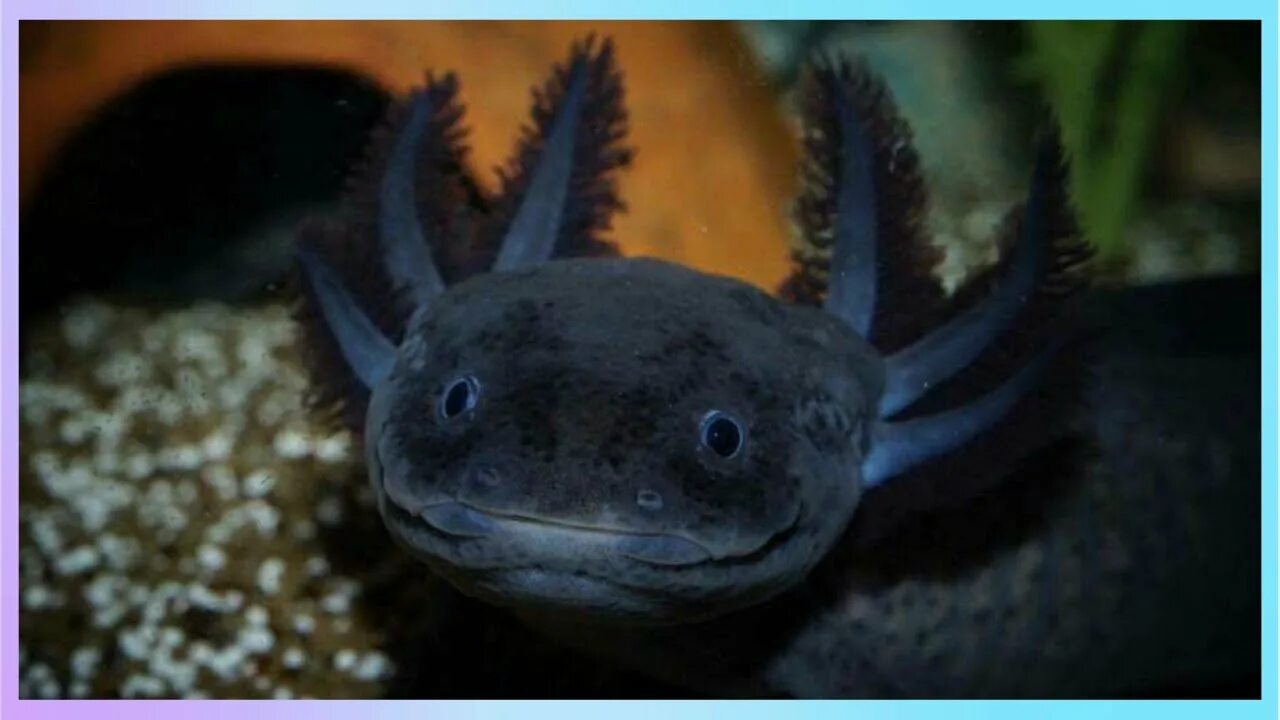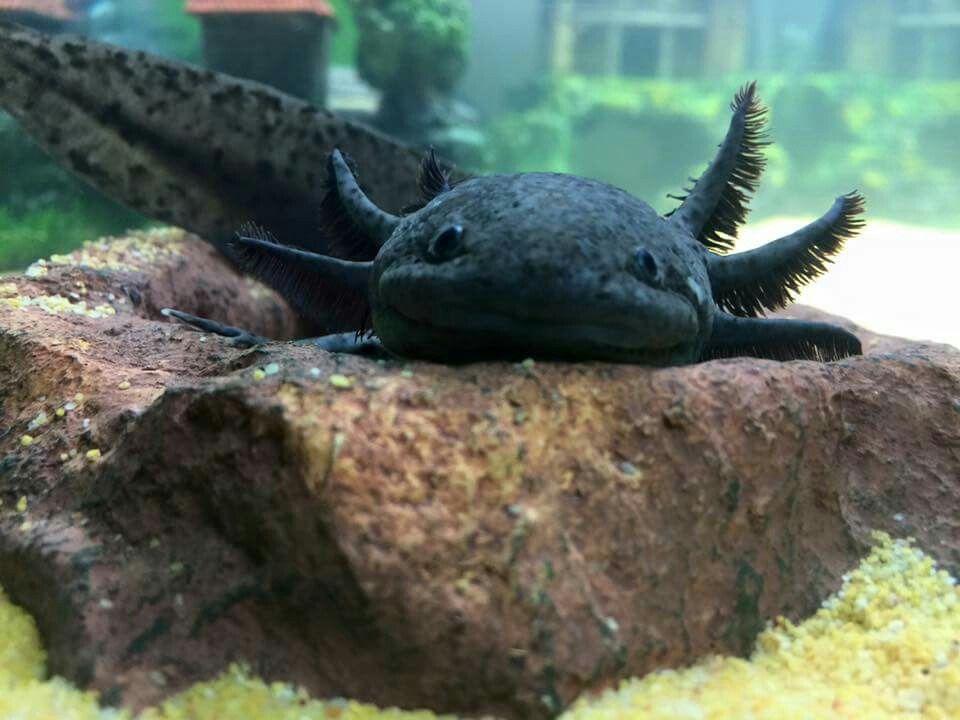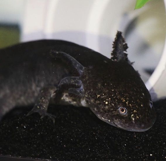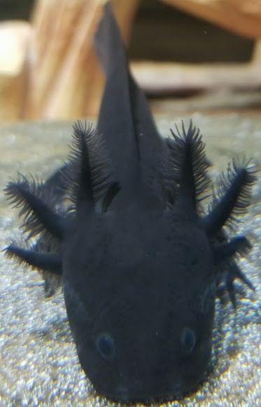 - Отличительная особенность — насыщенно-чёрная, матовая кожа, которая в хорошем освещении может казаться бархатистой или слегка металлической. Этот эффект создаётся за счёт высокой концентрации меланина. Иногда аксолотль может иметь тёмно-графитовый или коричневатый оттенок, особенно в юном возрасте или при определённом освещении. У здоровых особей пигментация равномерная по всему телу, без пятен, полос или светлых участков.