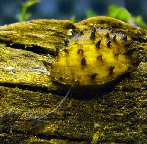 Панцирь светло-коричневых тонов с мелкими иголочками. Отсюда и произошло русское название «ёжик». У малышей-улиток таких иголочек ещё нет.
