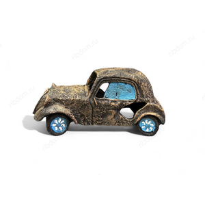 Необычная декоративная фигурка в виде старого затонувшего автомобиля с яркими синими колесами.