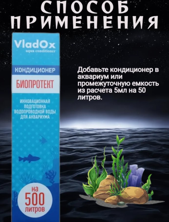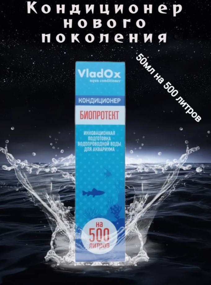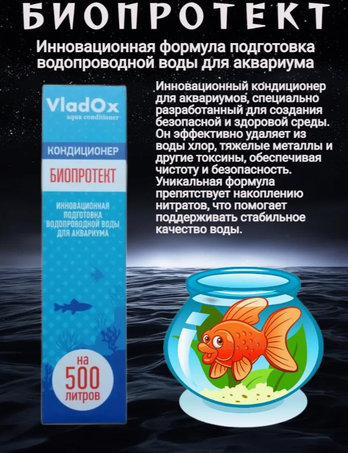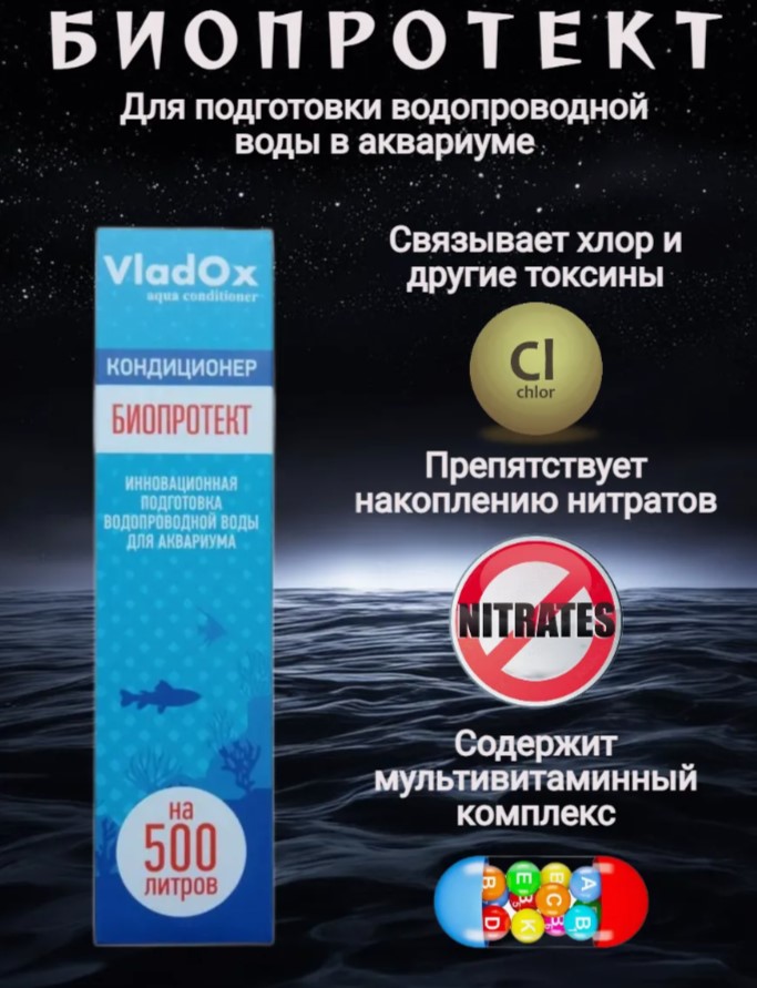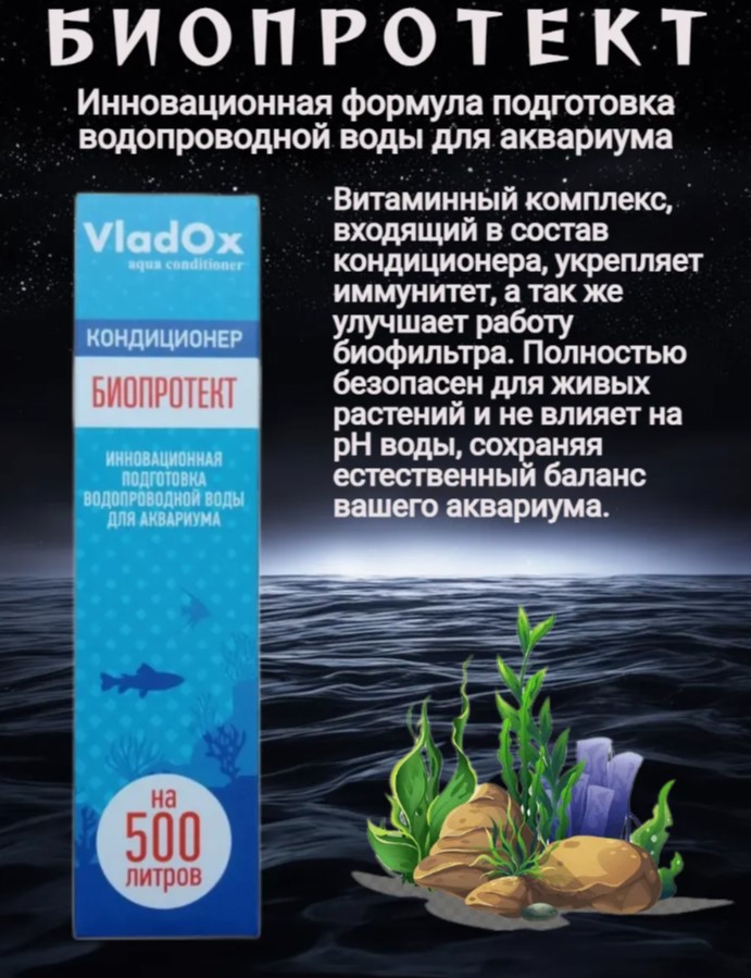 VladOx БИОПРОТЕКТ— это кондиционер нового поколения для подготовки воды в аквариуме. Он эффективно удаляет из воды хлор, тяжёлые металлы и другие токсины, а также препятствует накоплению нитратов.